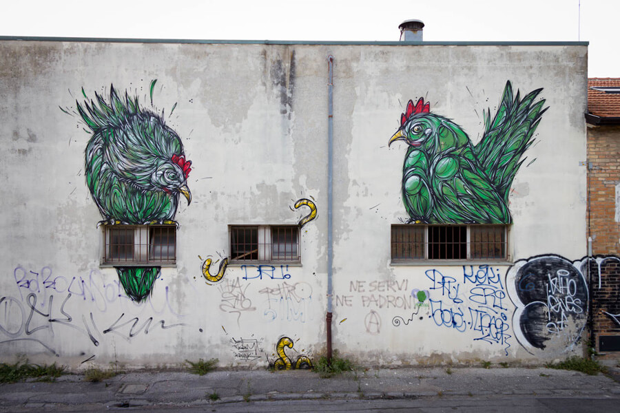 The artists have already begin painting the walls in the docks neighbourhood specifically, Dzia, a Belgian street artist, who’s recognised for his stunning murals of animals, which he creates using his signature style made up of a whirling lines which capture not only the animals in their natural form but also their physique. Dzia paints three doves in blue, and it looks as if there is a fight for the females attention, with one dove pumped up as the other male looks on. Further up Dzia paints hens that are both looking at their next meal! Who will get the worm?