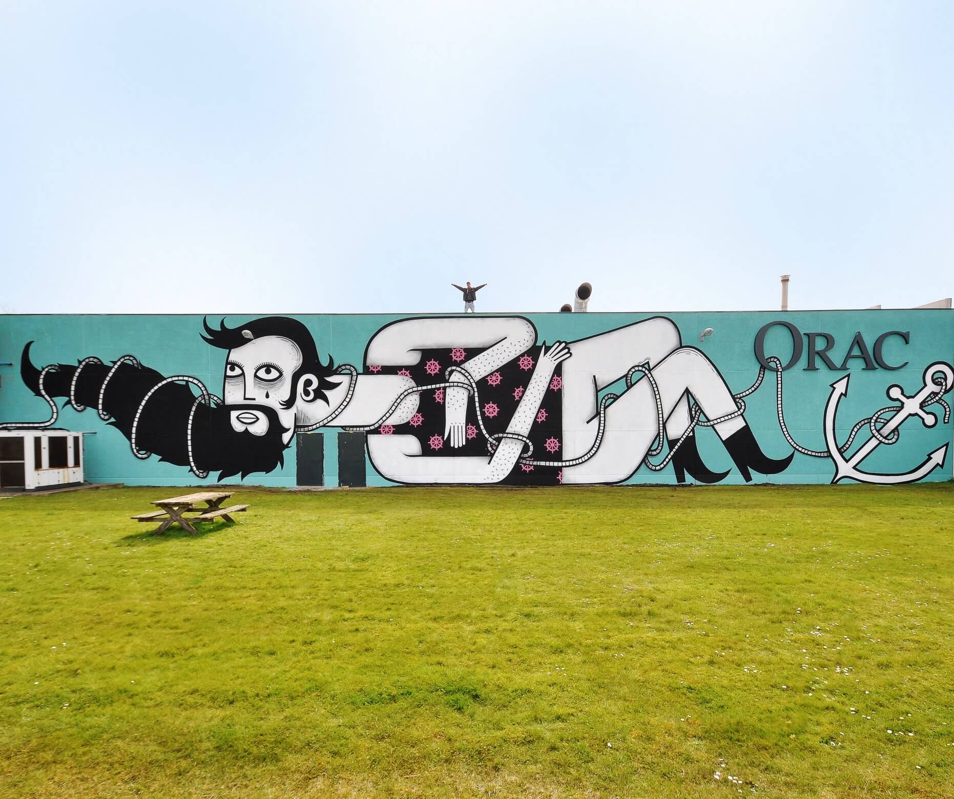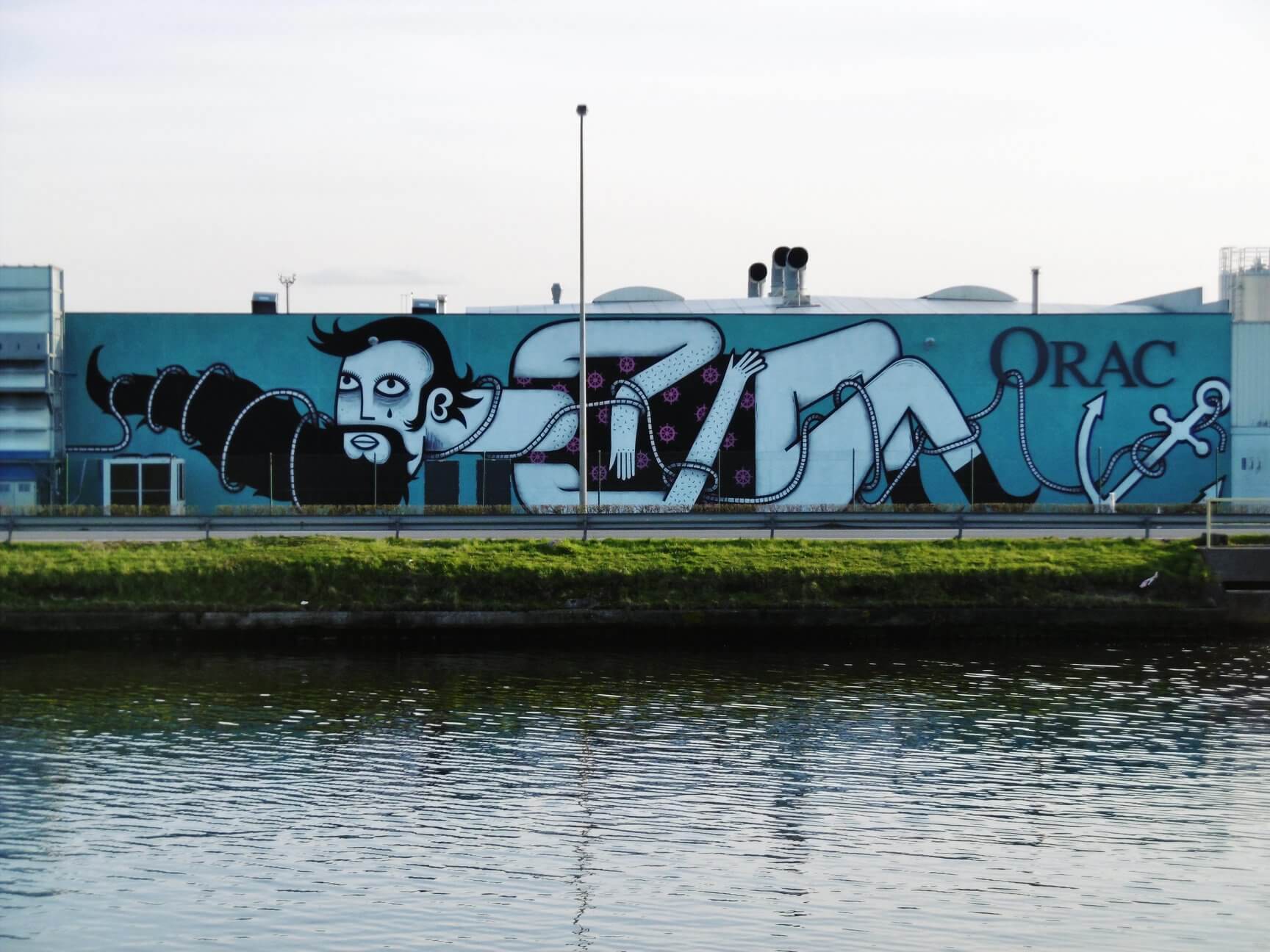 “I got chatting to an older man who could tell from my accent that I was not from Ostend. The man told me with pride that he had lived in Ostend all his life and that he had always worked at sea. He had even been a helmsman and said he had ‘spent more hours at sea than on the mainland’. The tone in his voice changed when he said that he “felt trapped on the mainland” since his retirement. I had to get off at Ostend station. With a slight melancholy feeling I left the tram. The sentence “caught on the mainland” continued to reverberate in my thoughts. That is why it seemed obvious to me to base my design on that. A sailor entwined in his ‘sailor ideals’ caught on the mainland. The anchor that is normally used to control a boat at sea now holds the man in his grip. The little ‘rudders’ that form a pattern on his sleeveless T-Shirt refer to the man’s past as a helmsman. The location of the wall (Oudenburgsesteenweg), on the border between water and land, is also ideal.” Joachim