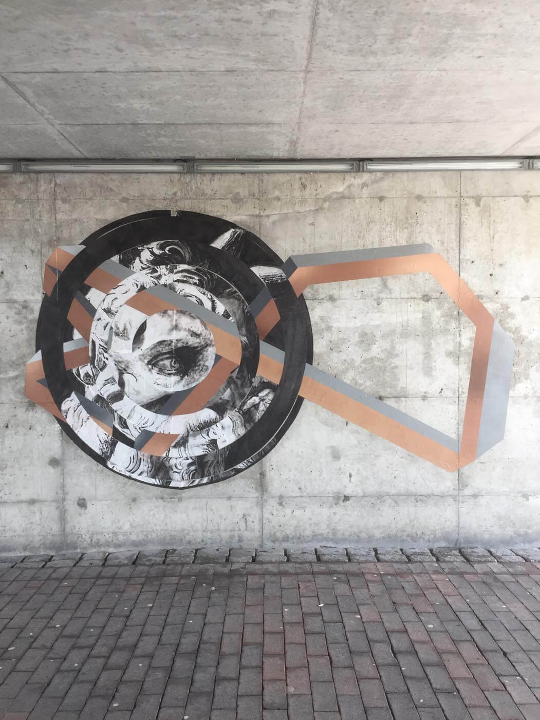 The image is a portrait made from Michelangelo’s sculpture of Moses (the law giver) with an additional abstract element. The paste-up is made of 16 pieces. It’s a technically difficult piece to make since the second, forth and sixth rings had to be placed first and judging the spacing and dealing with wind isn’t easy. The abstract shape was then placed on top and circle’s one, three and five pasted into place to finish. I wanted to give the piece an odd sense of depth and weight. The portrait is skewed, but if you stand at the right angle you can see the whole face. I hope I’ve added something interesting to the space.” Nipper