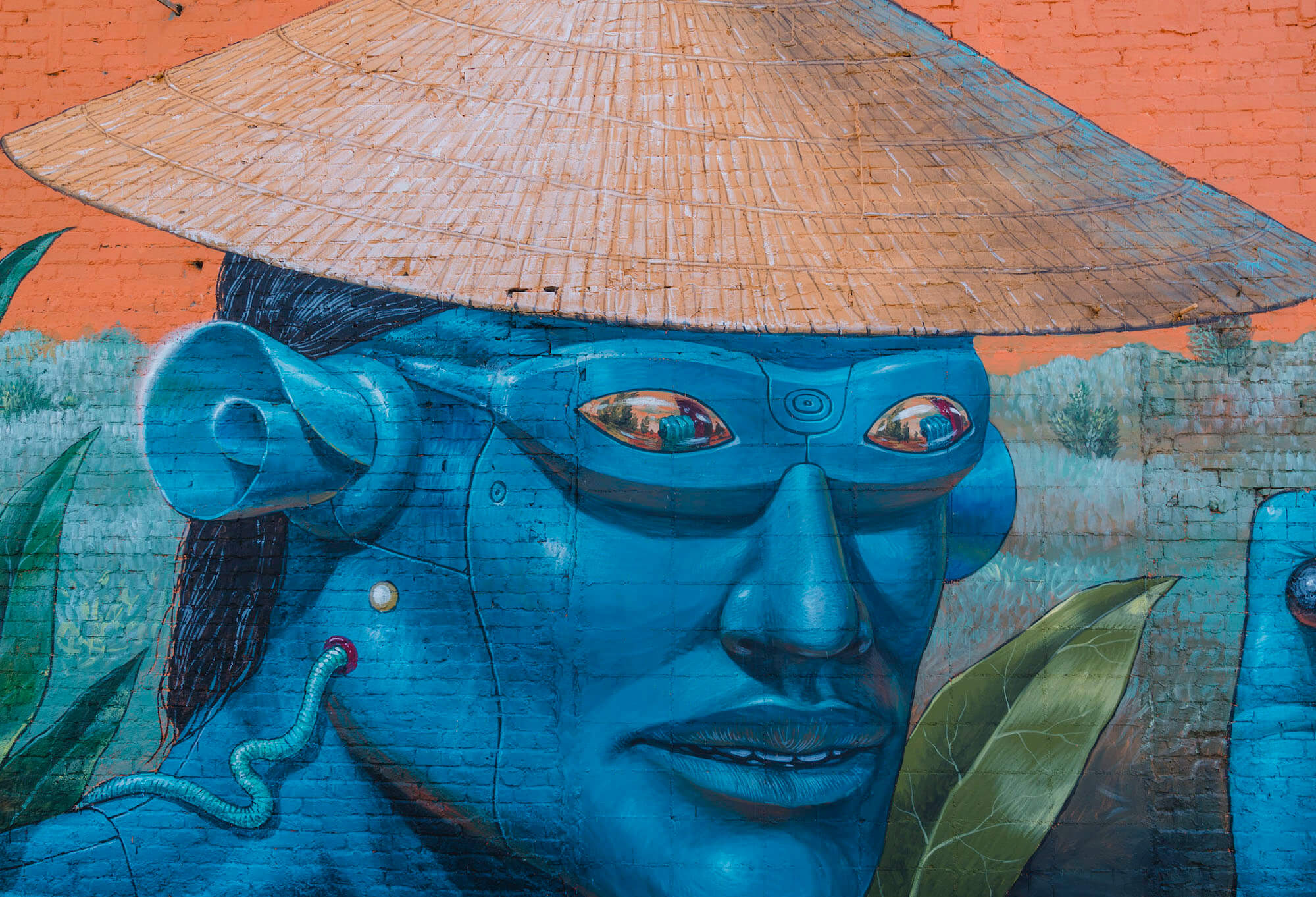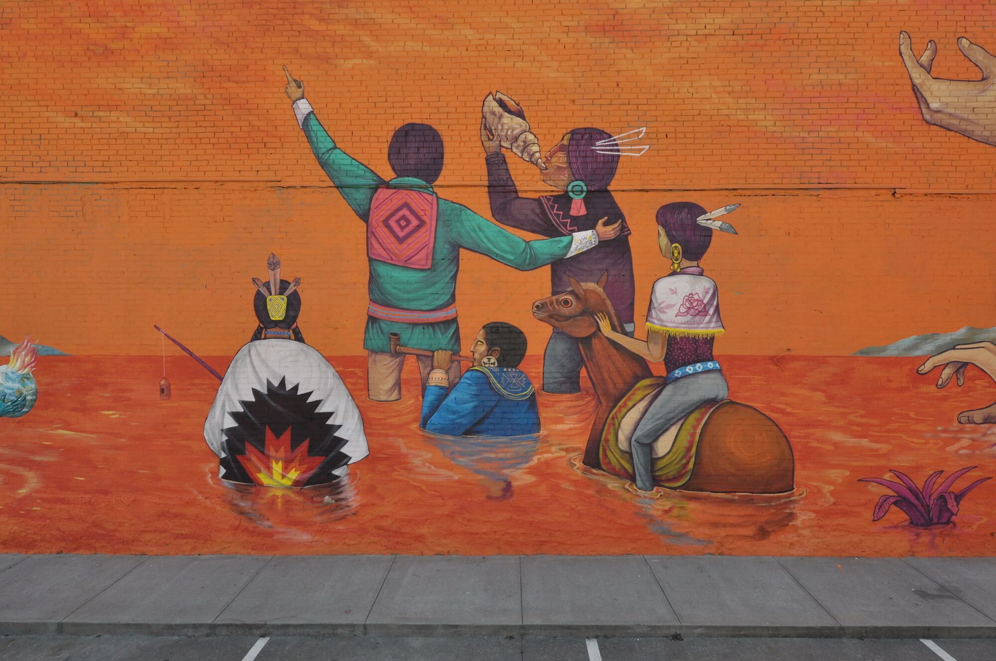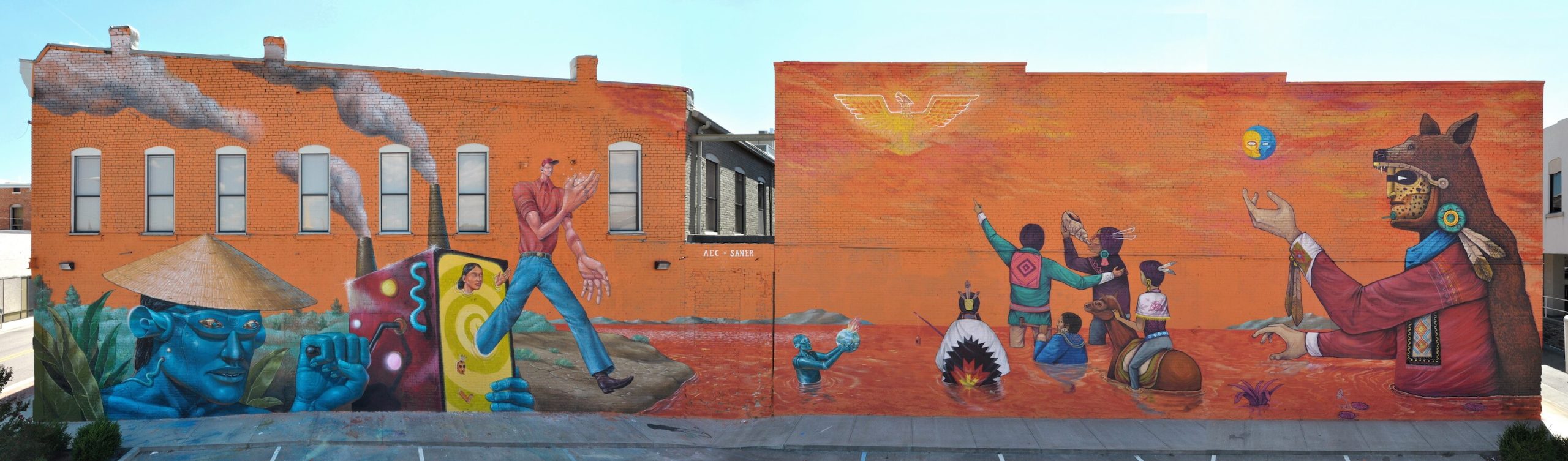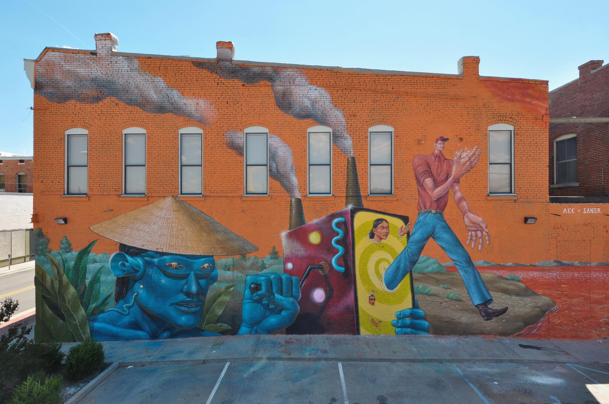 Mexican master muralist Saner teamed up with Ukrainian oneiric decoder AEC from the world famous duo Interesni Kazki, their latest folkloric collaboration is a spectacular oneiric mural about multiculturalism at the corner of 8th street and Garrison ave.
