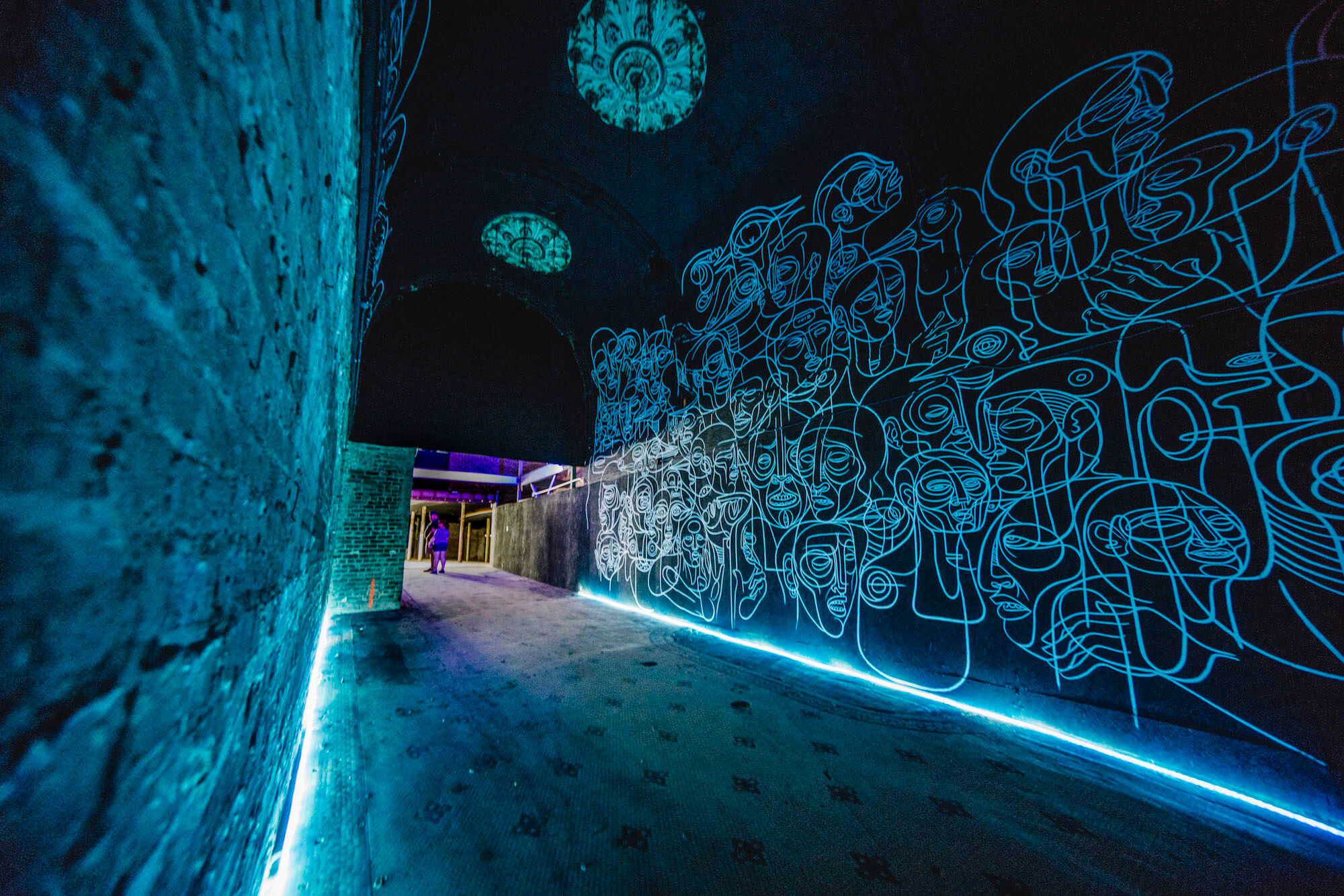 To kick off the week long art programming in the downtown area, legendary New York artist Doze Green introduced his metaphysical reinterpretation of life with “The Divine Sparks Project”. The project encompassed diverse media such as animation, muralism, light and sound installation inside an abandoned 10,00 square feet Art Nouveau Theatre originally built in 1910. The installation, which was produced in a time frame of five weeks, marks a revival for the historic landmark, which had remained closed to the public for more than thirty years.