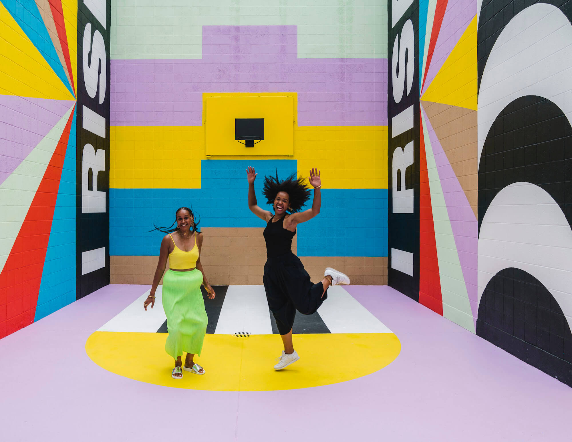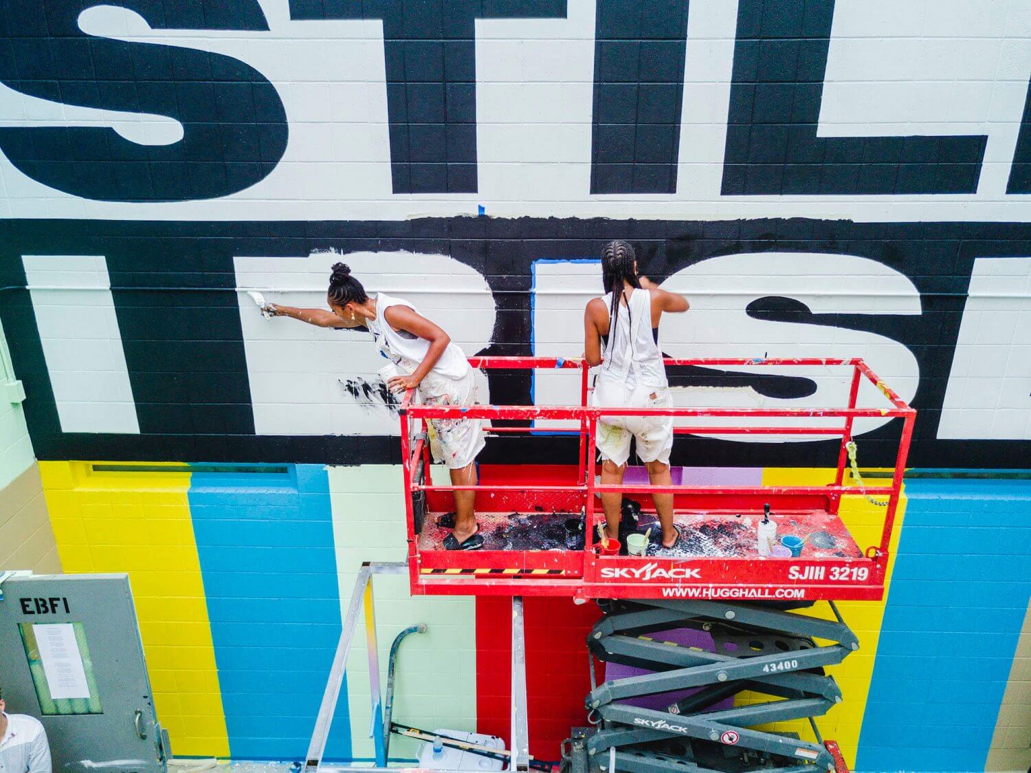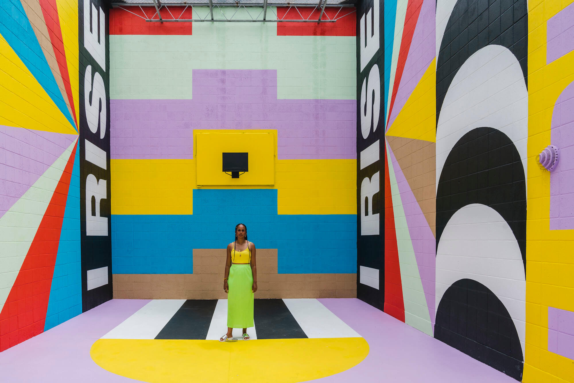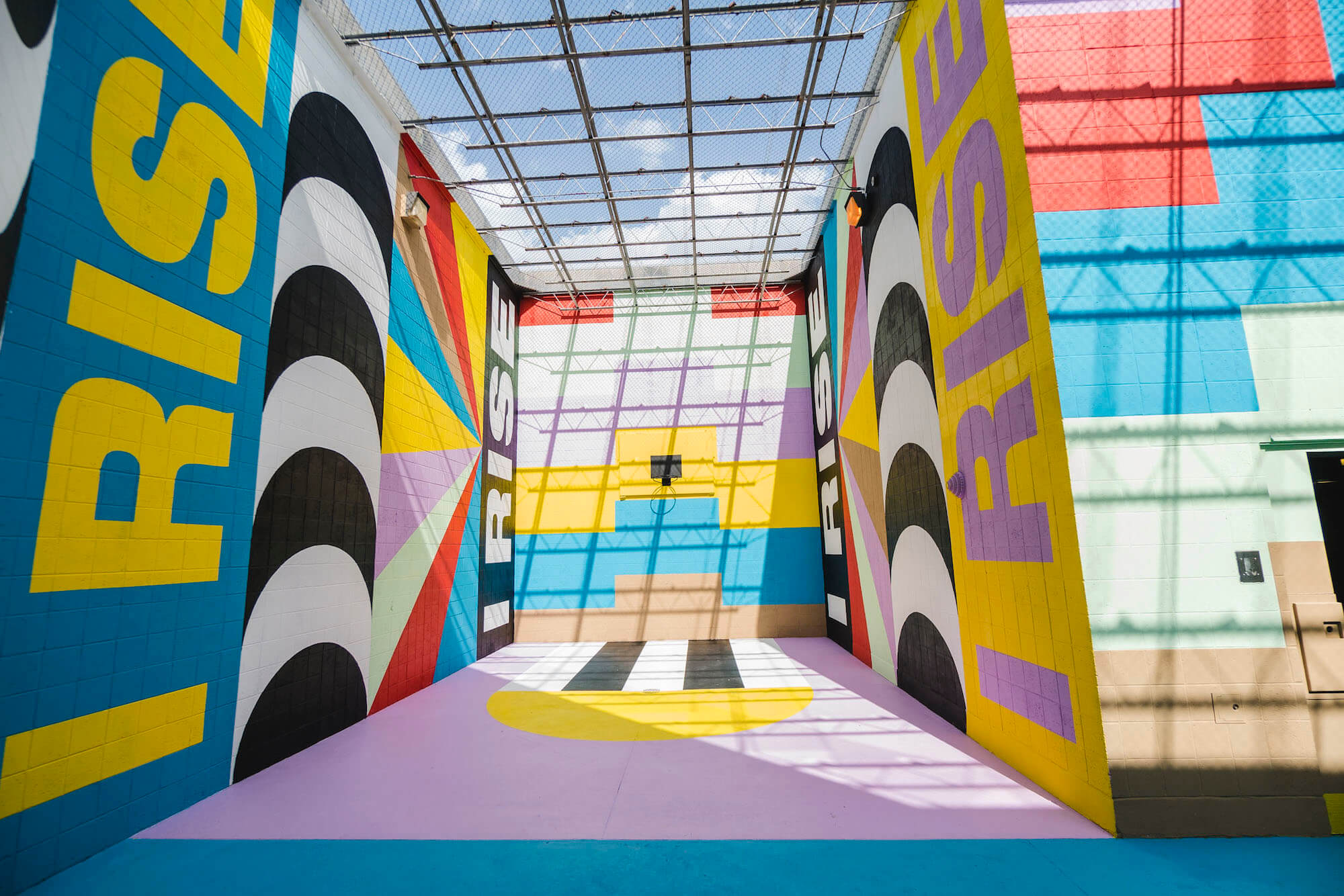 London Artist Lakwena Maciver brought her uplifting typography to Fort Smith’s Juvenile Detention Center with the help of the young detainees. Her brand new installation “Still I Rise” is a 360° mural inspired by the beautifully powerful poem of Maya Angelou (who spent her childhood in Arkansas), painted on the walls and floor of the centre’s courtyard with the help and participation of the young detainees. Maya Angelou’s poem focuses on a hopeful determination to rise above difficulty and discouragement.