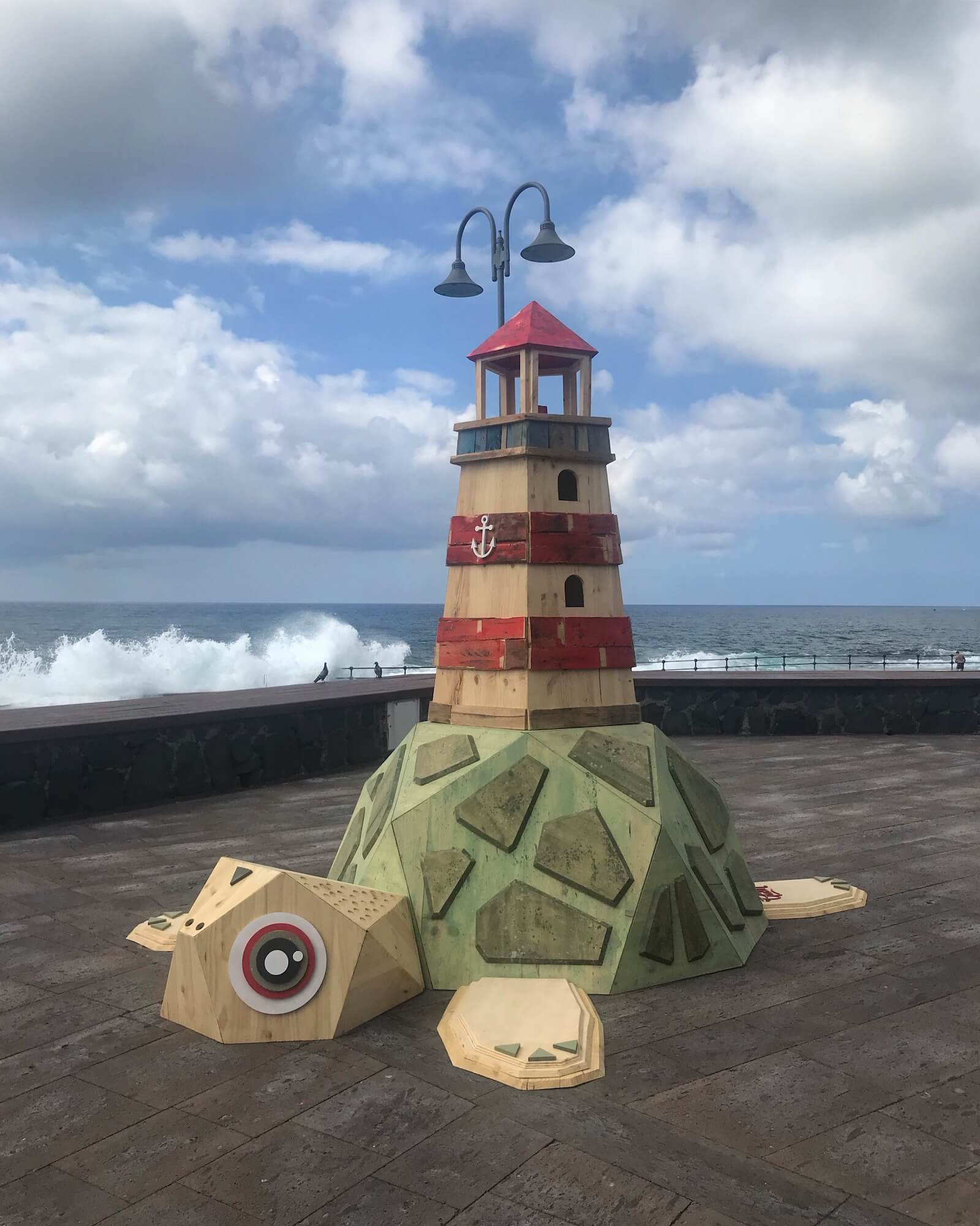 Glam Catarina used recycled wood to create her turtle by the sea with a light house on top. Hundreds of marine turtles die every year after becoming entangled in rubbish in the oceans and on beaches, including plastic ‘six pack’ holders and discarded fishing gear.