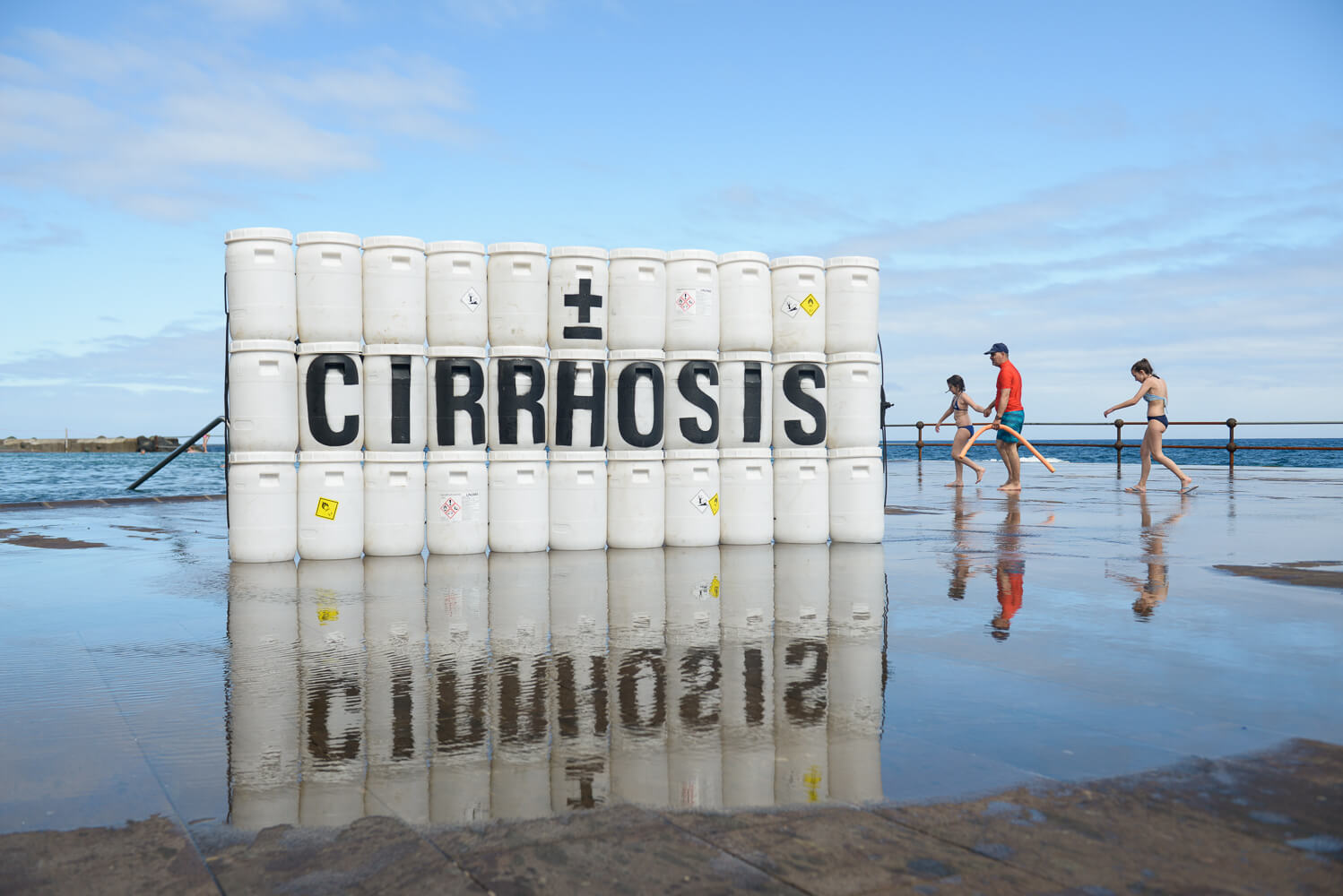 ±MAISMENOS± also wrote Cirrhosis (liver damage) on water barrels at the Bajamar swimming pools, Cirrhosis is a condition in which the liver does not function properly due to long-term toxic damage. Here ±MAISMENOS± cleverly highlights the ill effects waste, toxins and pollutants are having on our water supplies.