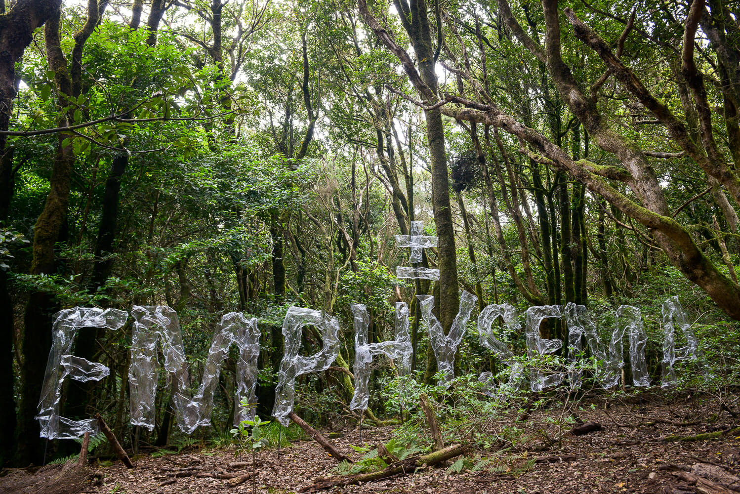 Artist ±MAISMENOS± was inspired by chronic human diseases. The word Emphysema (lung damage) was made out of empty plastic bottles within the forest. Trees help the planet breathe by turning carbon dioxide into clean, pure oxygen. Trees are considered the lungs of the earth because they produce oxygen, which is necessary for all life. Emphysema highlights the damage we are causing to the lungs of Mother Nature.