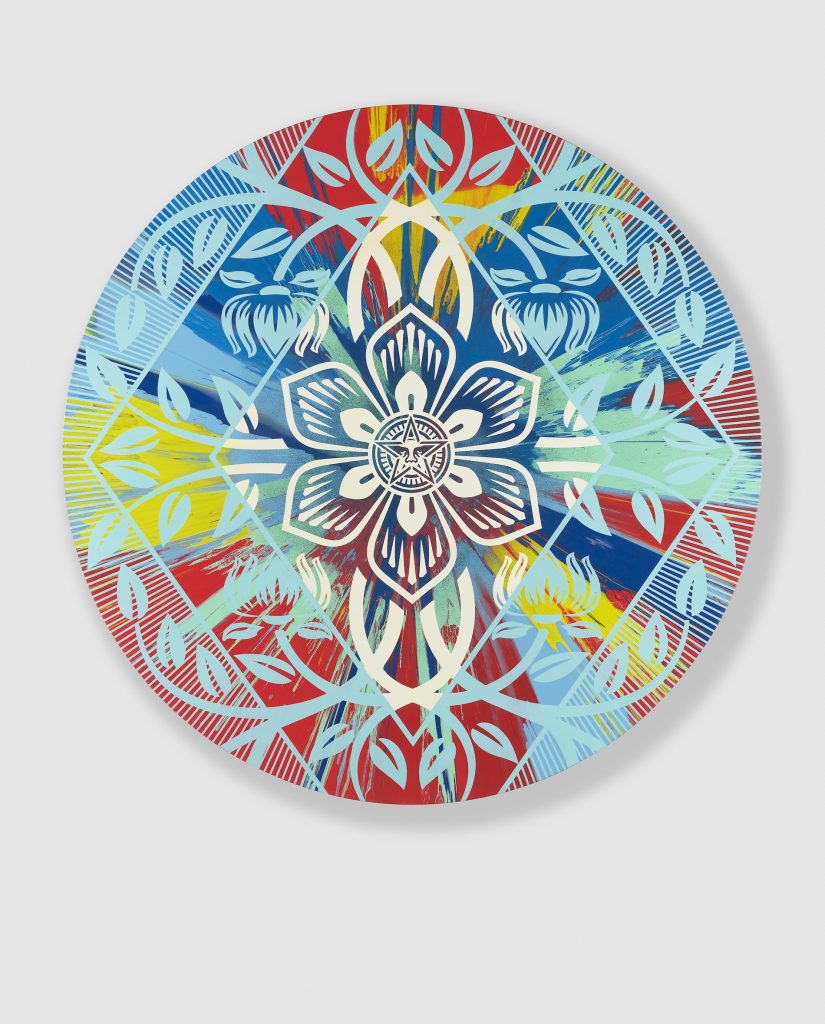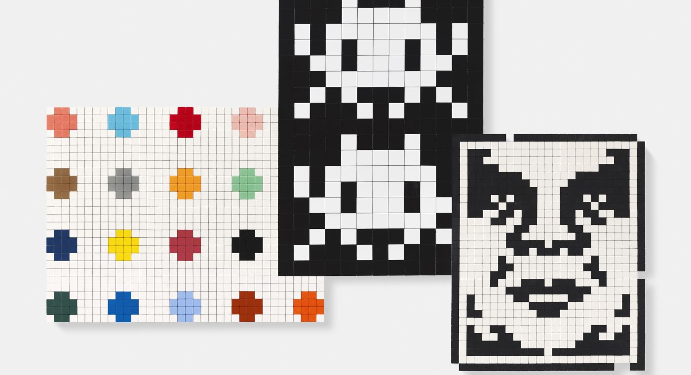 In Triple Trouble, Fairey, Hirst, and Invader fuse their visual vocabularies into new collaborative works. Familiar motifs are everywhere, Fairey’s OBEY propaganda graphics, Hirst’s dots and formaldehyde precision, and Invader’s pixelated mosaics, yet each has been reimagined, merged, and mischievously re contextualised.