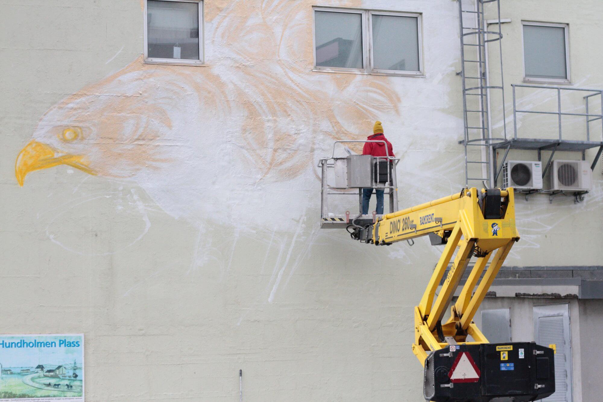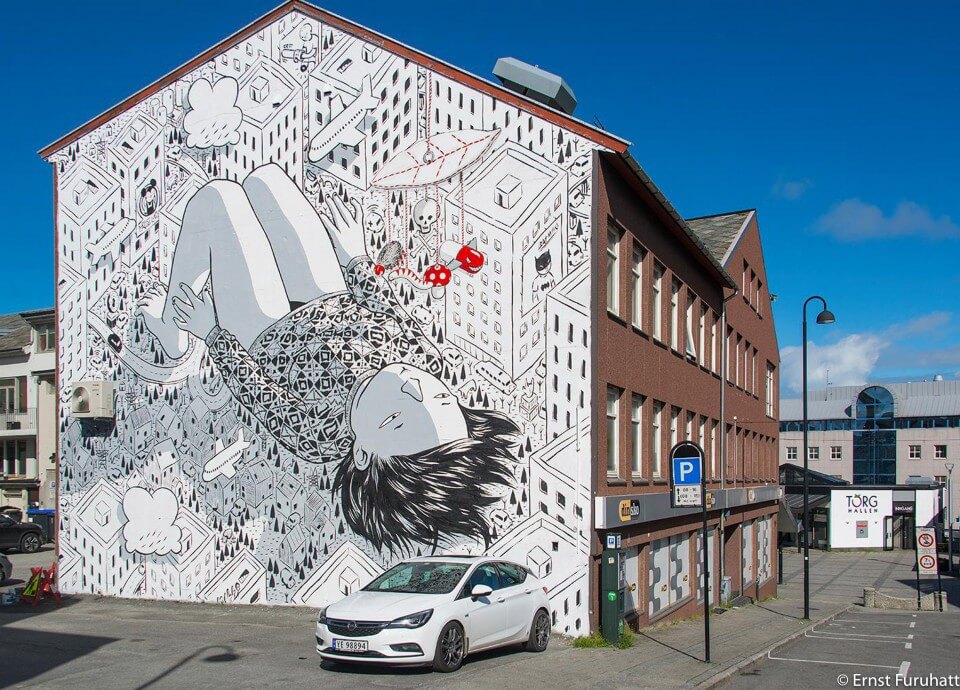 In July Bodø has the midnight sun, and 24 hour of daylight! And Millo represented this unique light with his mural titled ‘insomnia’