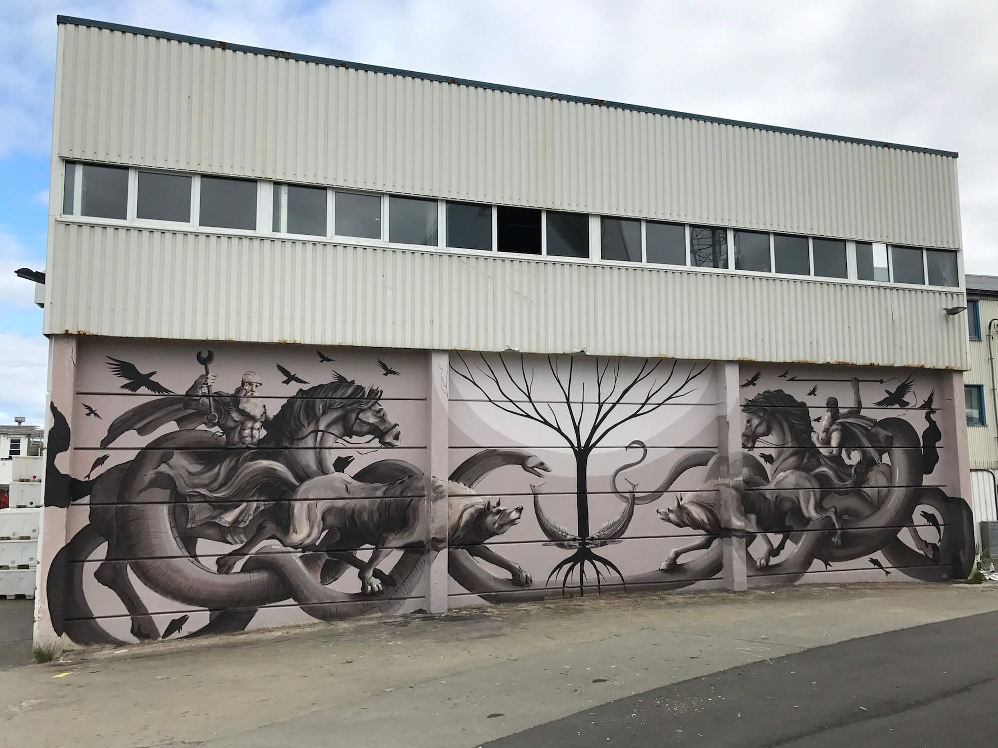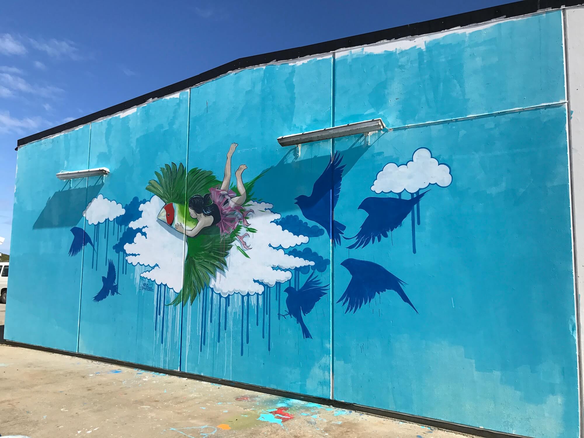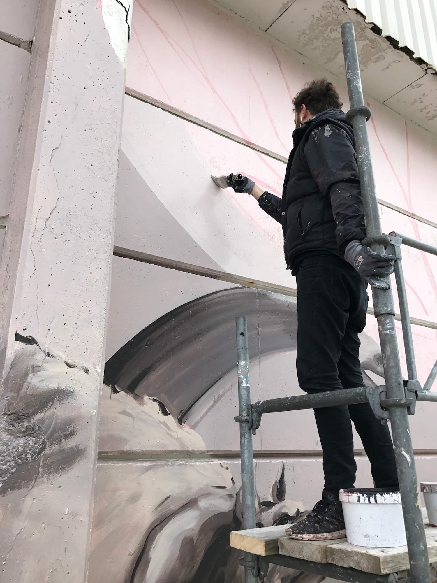 Jaz’s mural draws the eye to the fish tree in the centre. The two images are mirror imaged with a twist! The figure is cleverly painted on the left in reverse.