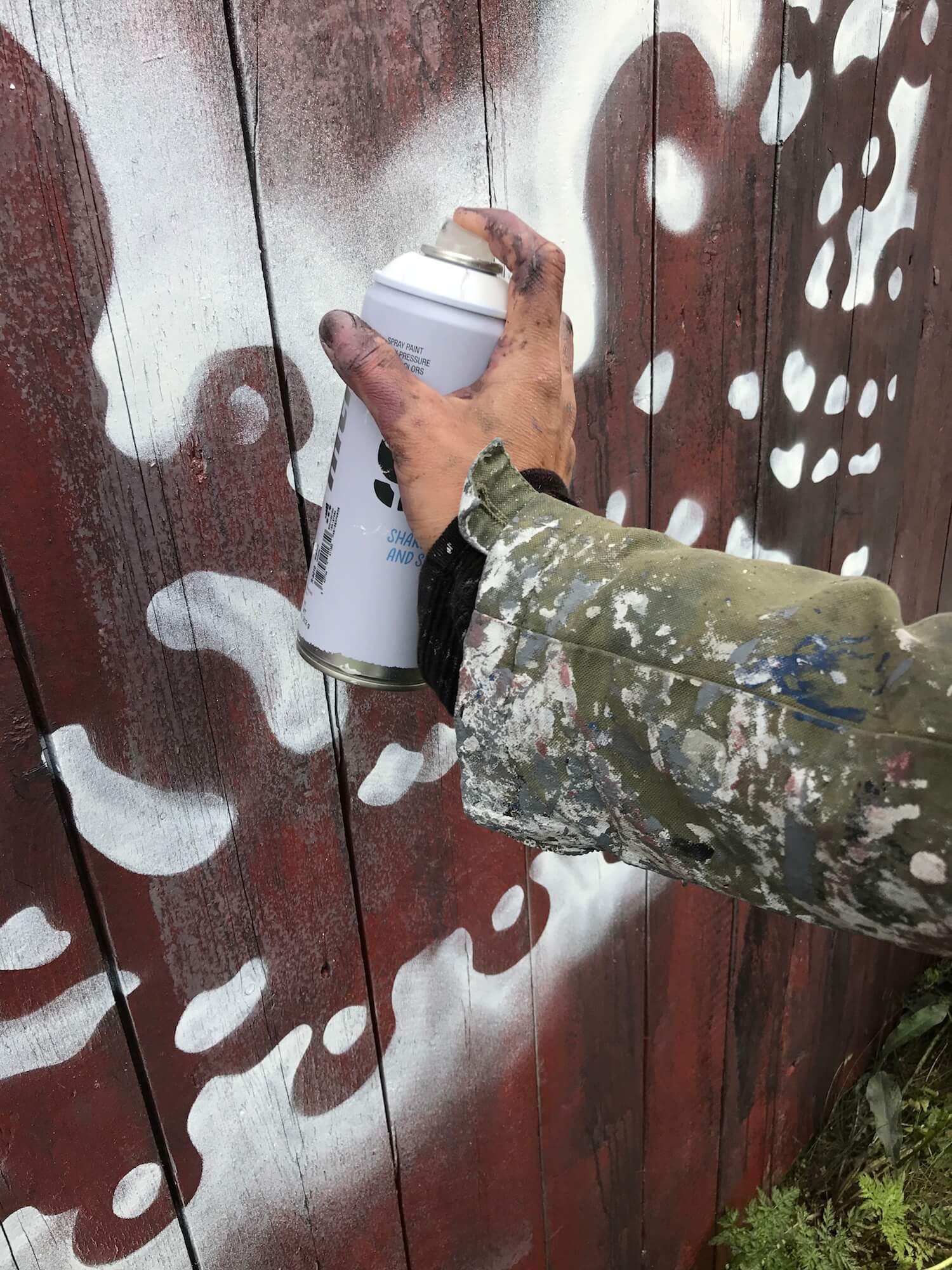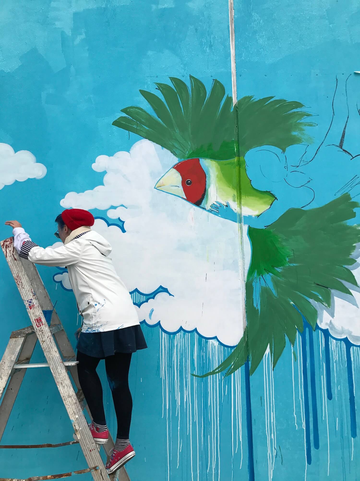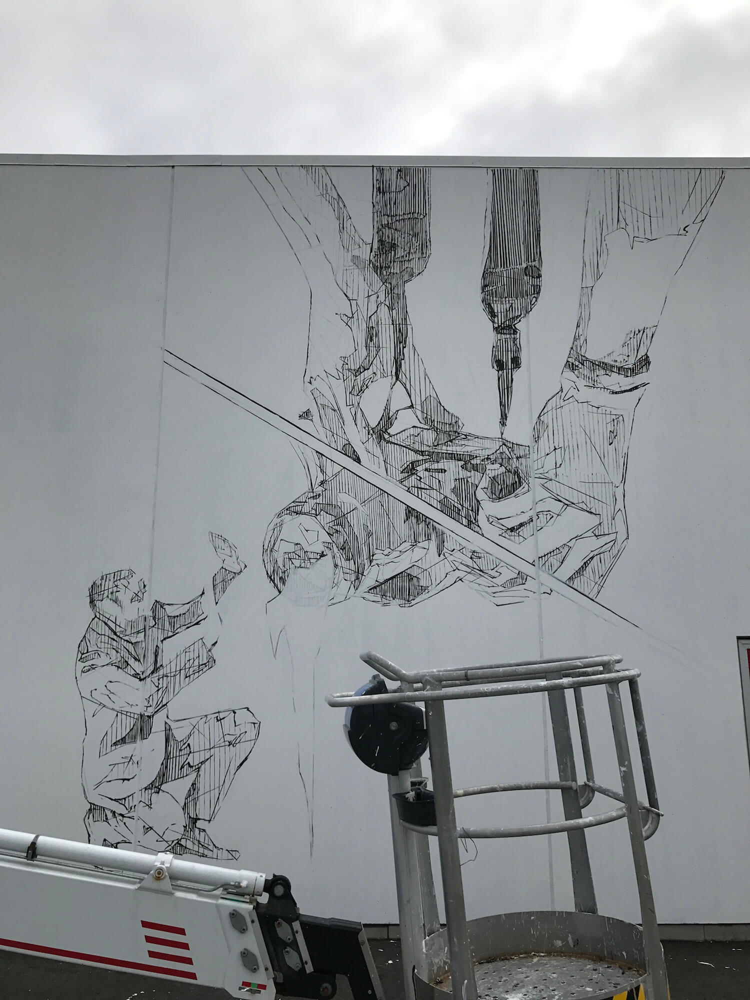 Jaz’s mural draws the eye to the fish tree in the centre. The two images are mirror imaged with a twist! The figure is cleverly painted on the left in reverse.