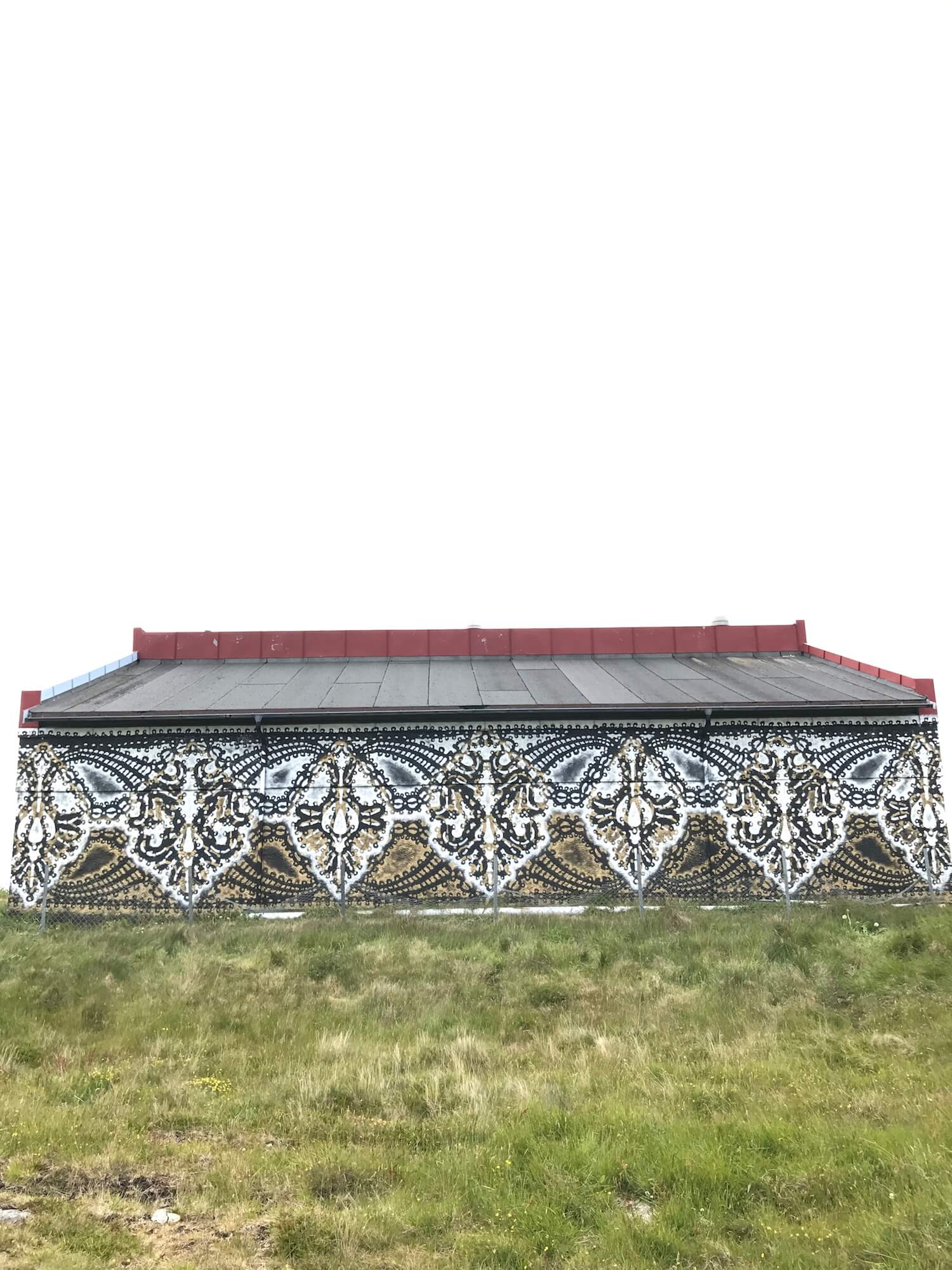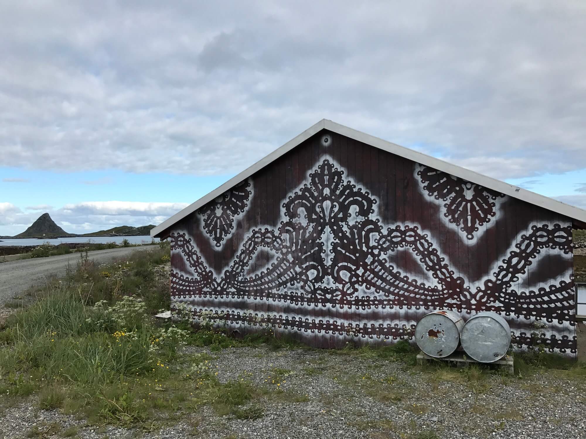Nespoon paints a venetian lace pattern onto a fisherman’s building, pulling together the islands medieval history and the connection with Italy.  The origin of trade between northern Norway and Italy, that made possible the combination of Norwegian stockfish and Italian cooking, came about by the shipwrecked Venetian sea captain called Pietro Querini, who was rescued by the islanders in 1432.