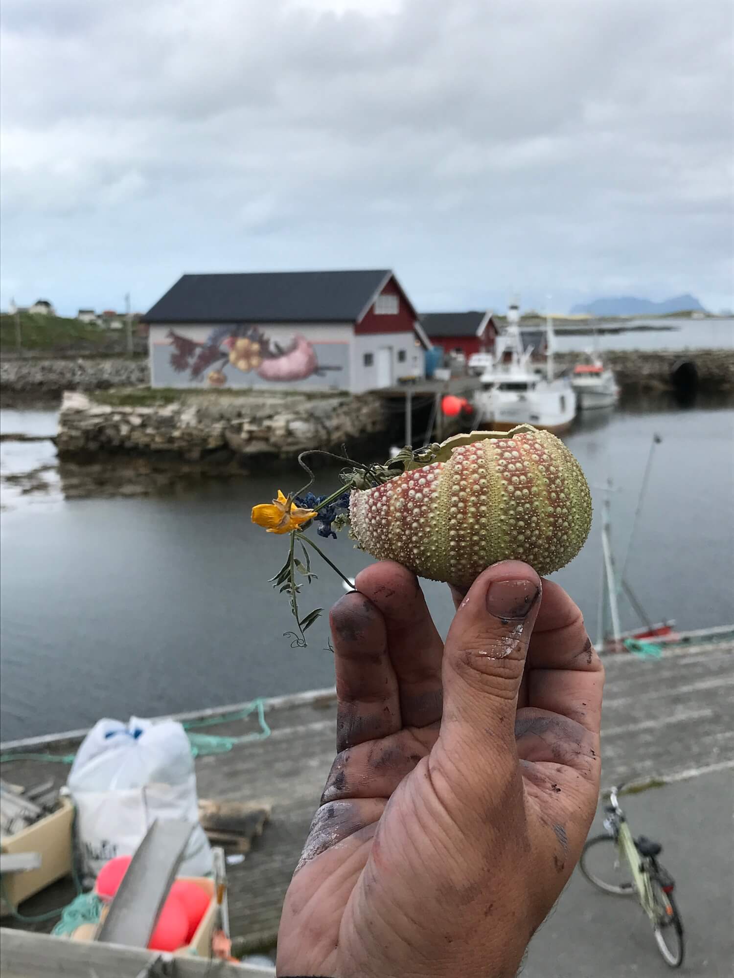 Pastel finds the local flowers of the land he paints in, this one is attached to a broken sea hedgehog, usually dropped by a seagull.