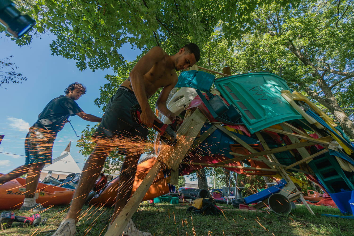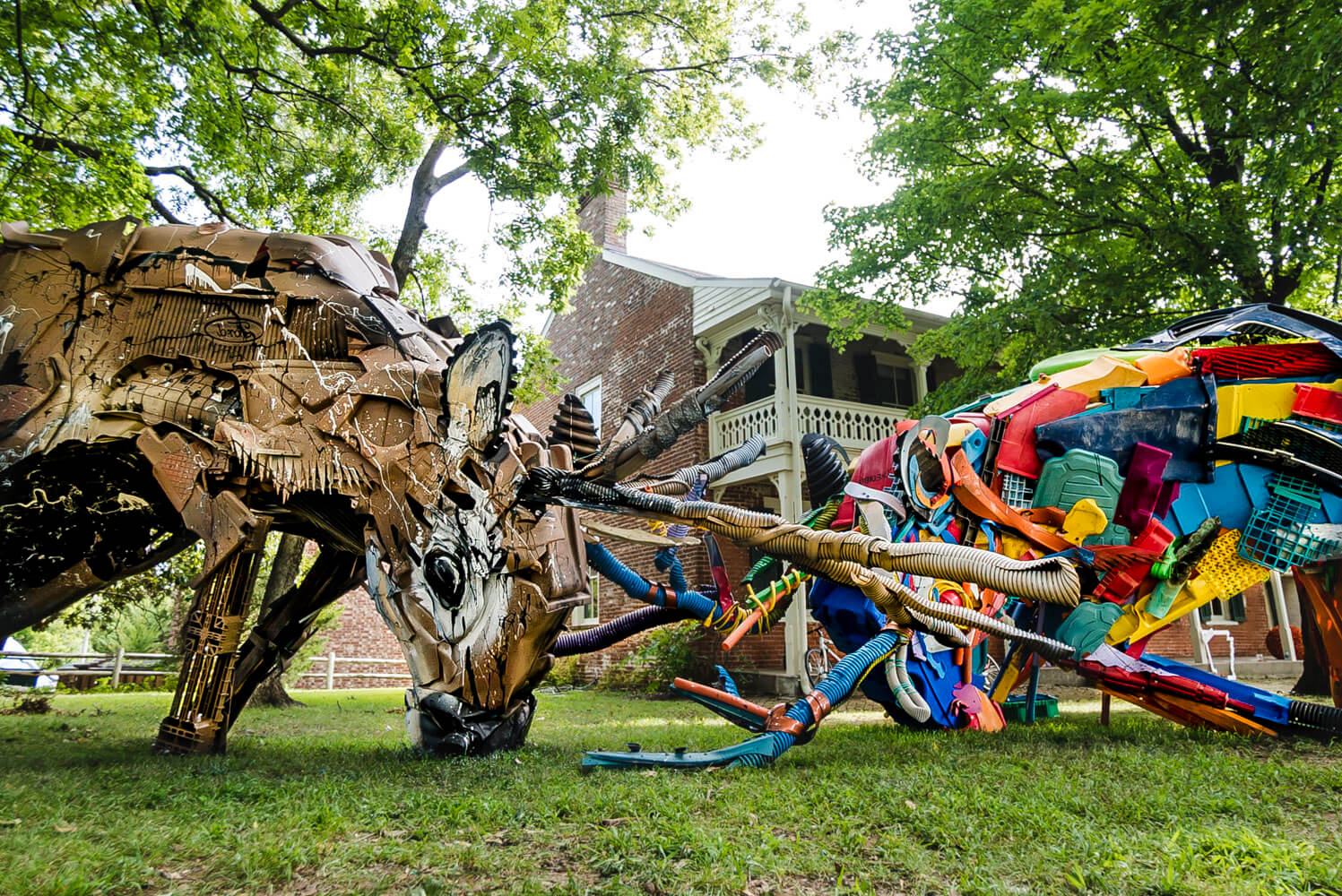 Portuguese “thrasher” sensation Bordalo II, who just finished his impressive solo show “Attero” last week in Lisbon, contributed with a large scale exempt sculpture made out of local trash titled Deer Half Deer. The piece – assembled in less than 3 days – depicts the local fauna mid-battle and is located in the front yard of the city’s historic Walker Stone House.