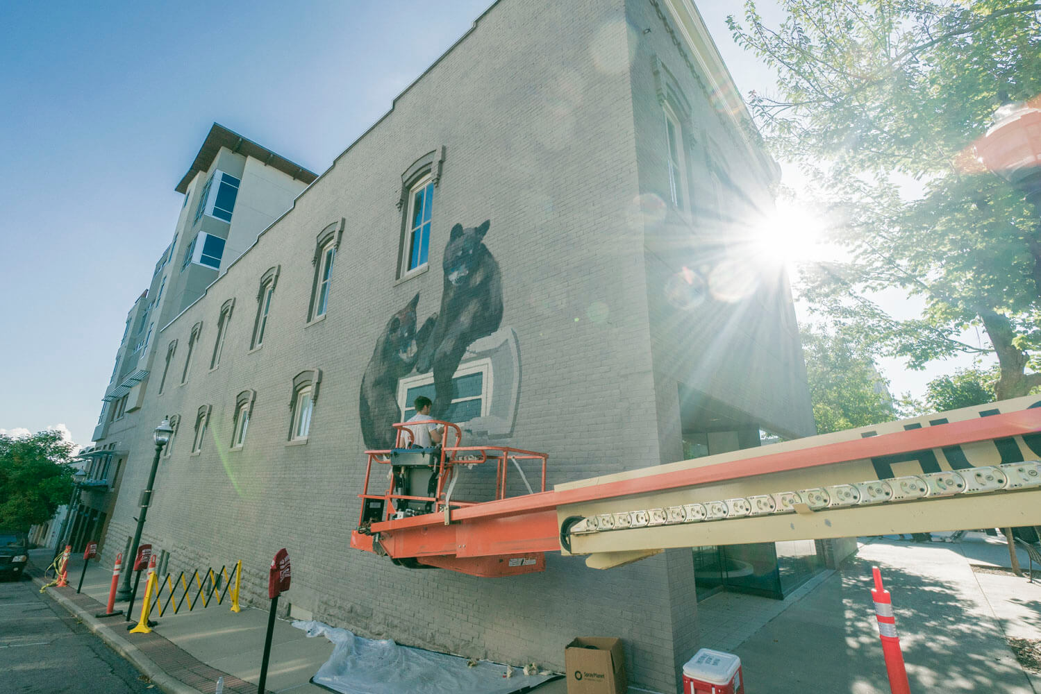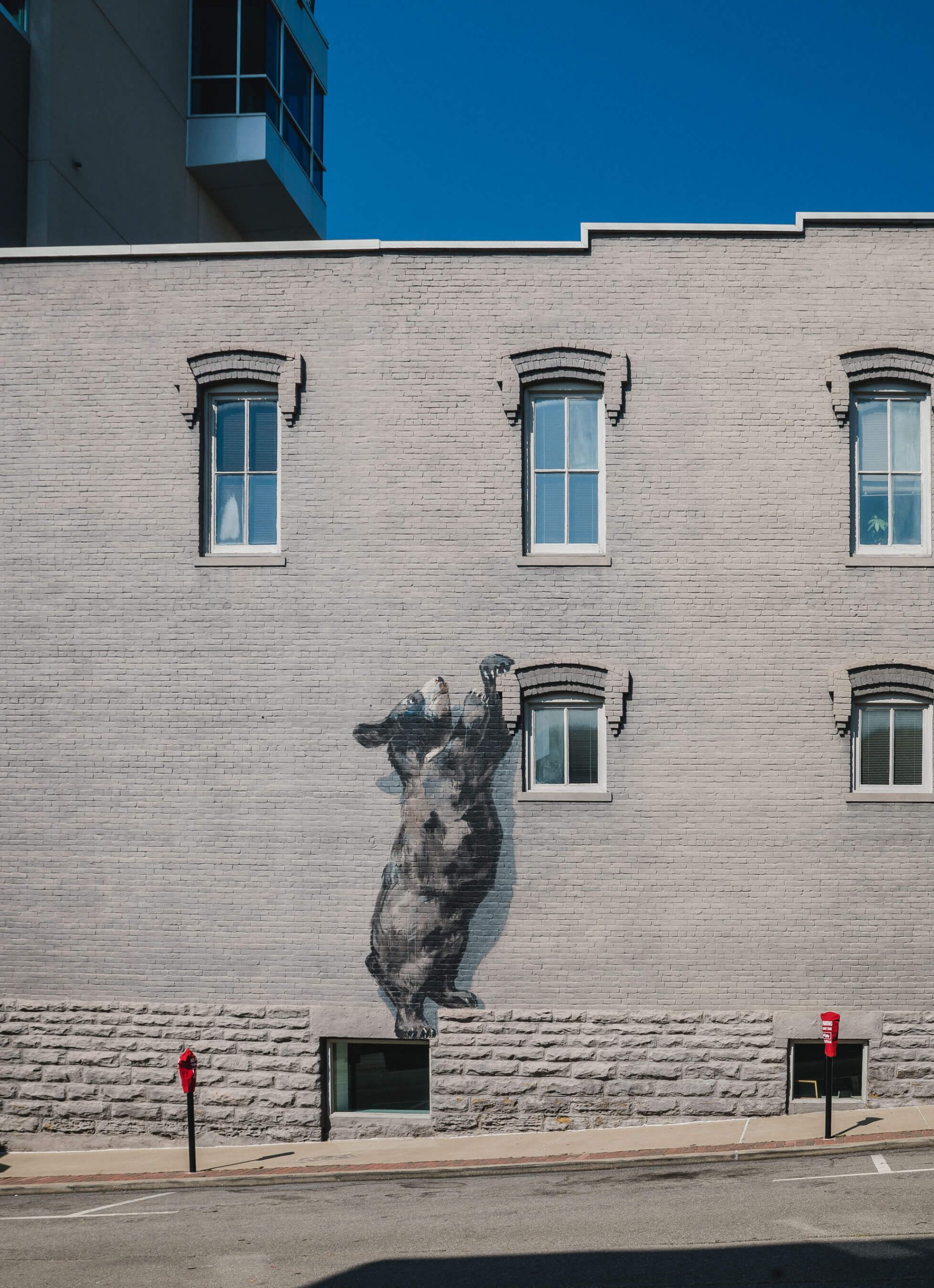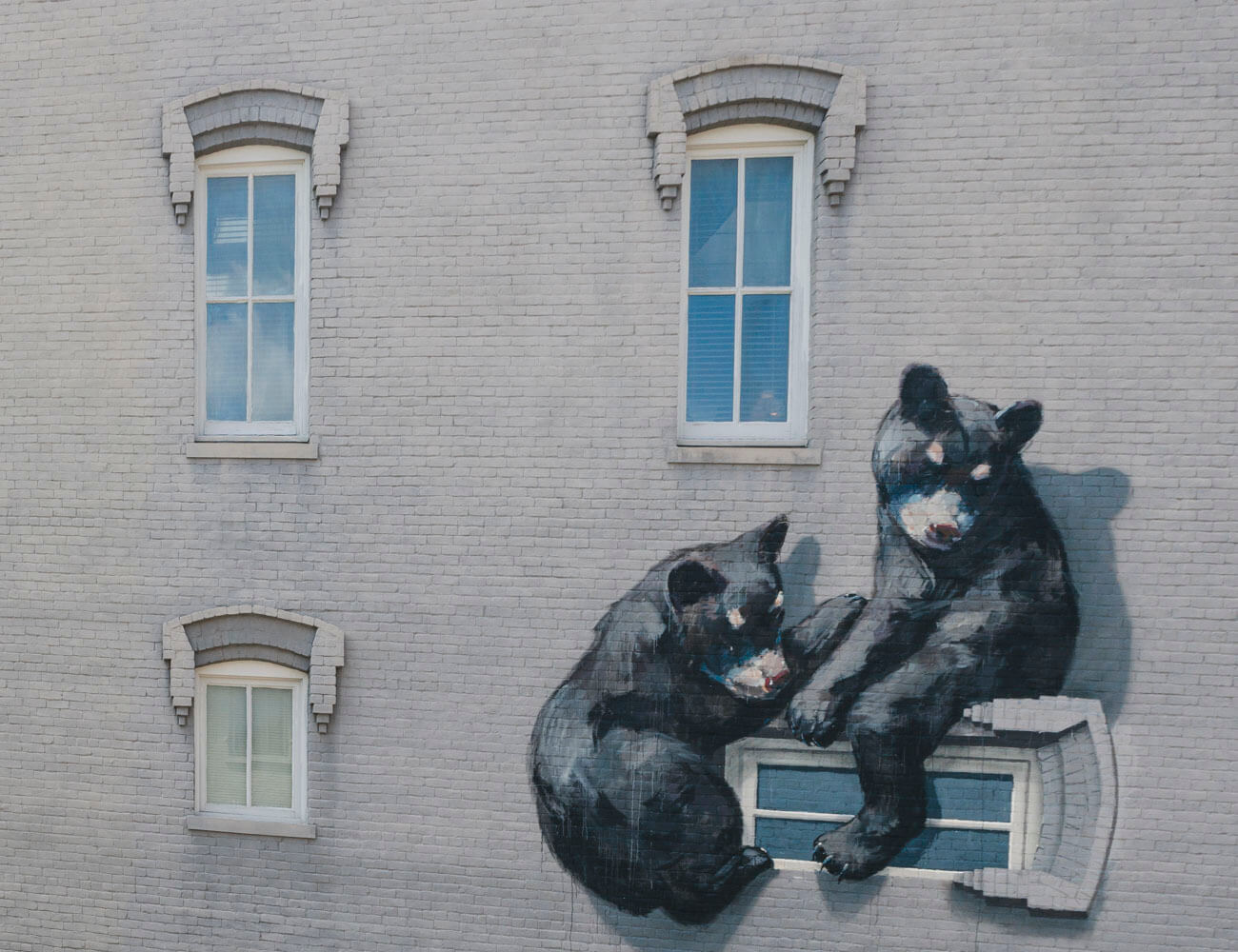 Lithuanian artist Ernest Zacharevic playfully depicted local fauna the Arkansas Black Bear now displaced to the urban ecosystem of Downtown Fayetteville square.