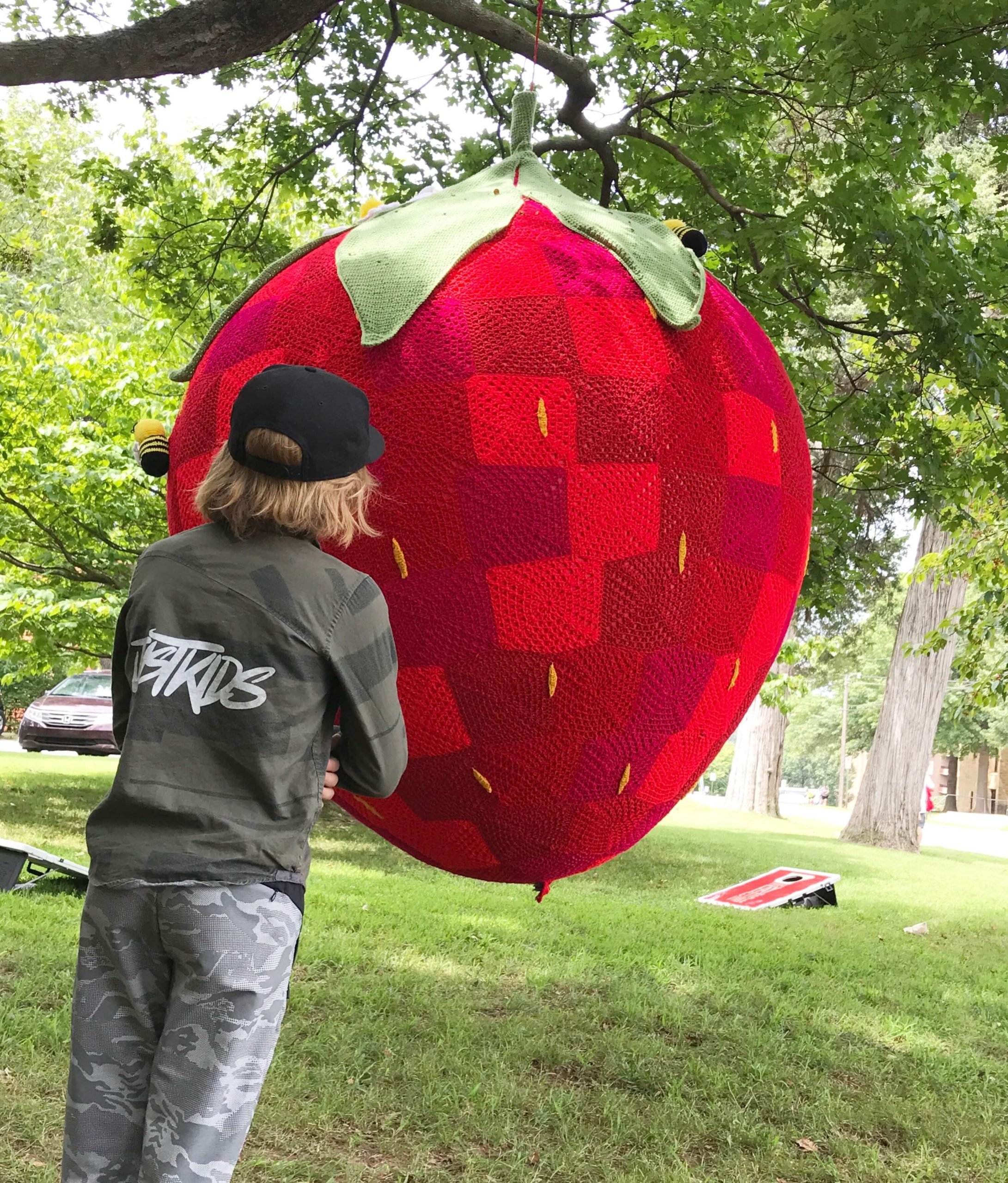 Gina Gallina joined the bike trail with a giant strawberry yarn installation piece hanging from a beautiful tree.