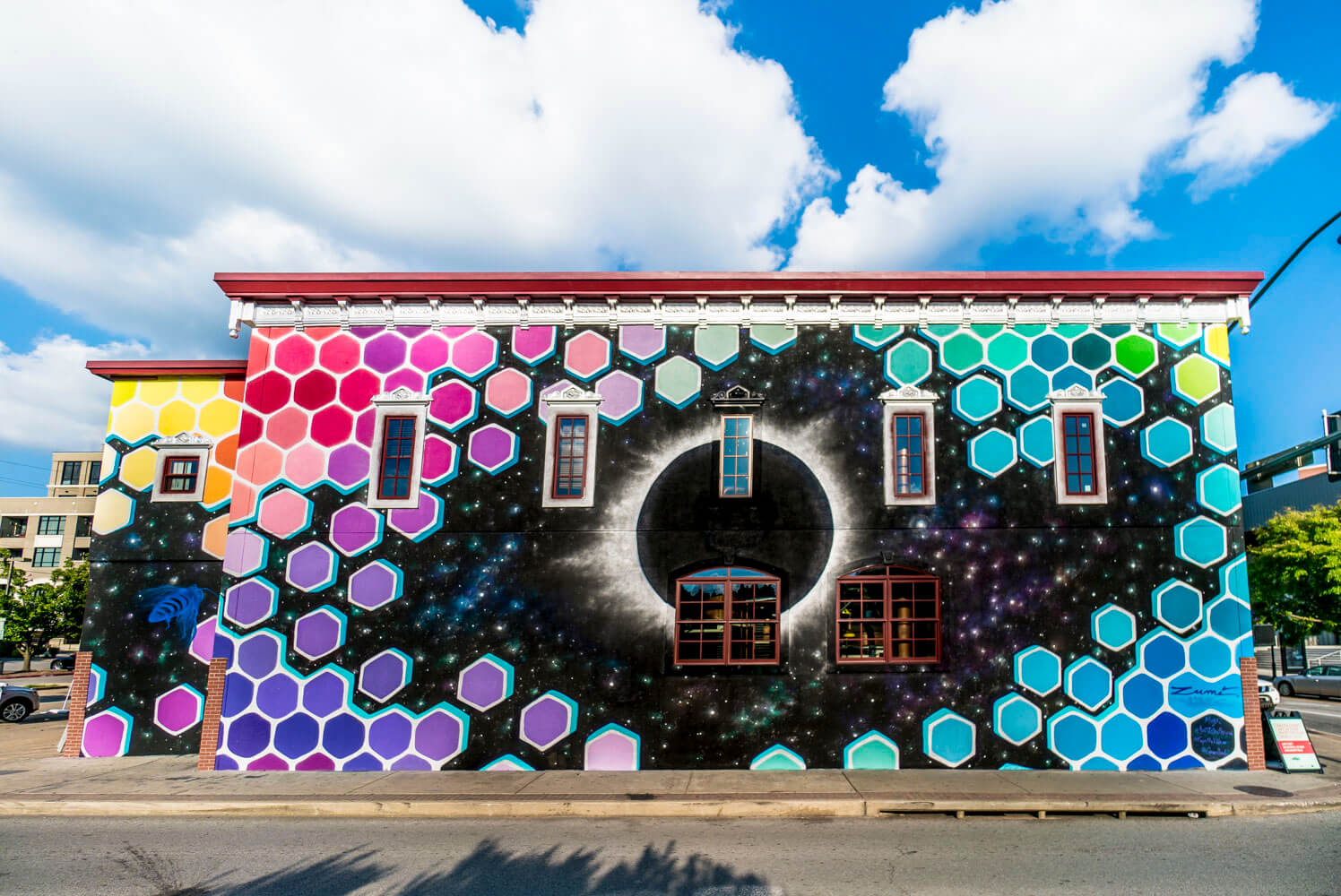 Argentinian Marina Zumi paid homage to micro and macro balance with a large scale rendering of her cosmic beehives produced in tune to the recent eclipse.
