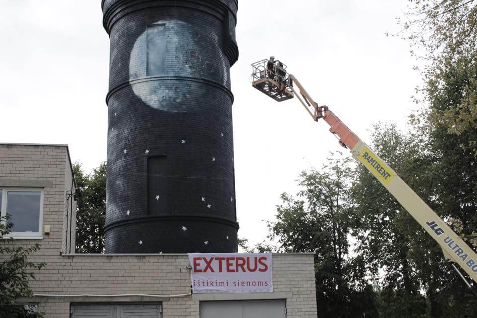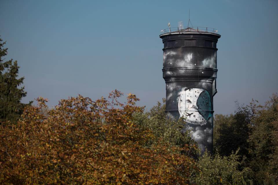 This year the third Vilnius Street Art Festival entered the train station district in Vilnius, Lithuania – an area usually perceived as a controversial part of the town. But looking from the point of transitional spaces, the area provided a lot of ideas for contextual art, with one of them suggesting that the city’s airport should be considered as a modern-time station. Therefore, the organisers of the festival entrusted this strategically important space for one of the most active Lithuanian street artists – Antanas Dubra who in the territory of Vilnius Airport transformed an old water tower into a tale of the night and the aviator’s dream to reach the moon one day. Technically difficult the work is named “The grumpy side of the moon” can be seen both during the day and the night because of the installed night-light.