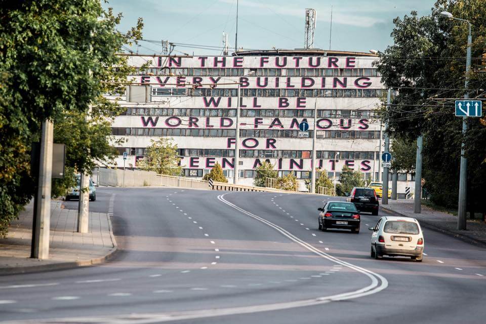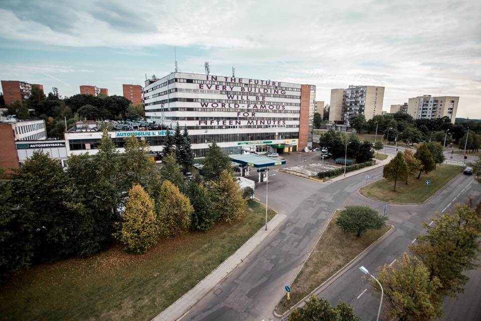 During Vilnius Street Art Festival MOBSTR has made his biggest mark ever – a large scale statement on a Soviet modernist building in Vilnius.