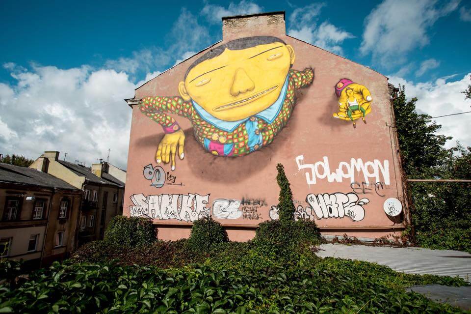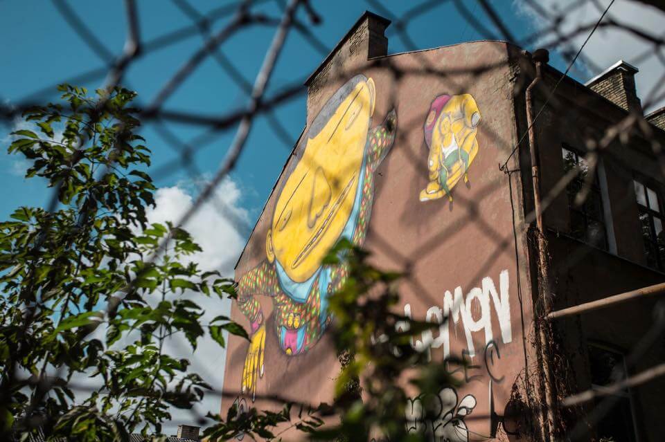 Brazilian twin artists Osgemeos came back to Lithuania with a very personal mission – to pay respect for their grandfather who is of Lithuanian descent. In their mural for Vilnius Street Art Festival brothers incorporated a picture of their grandfather sitting in a palm of a colourful giant – a very recognisable style with a unique Lithuanian twist.