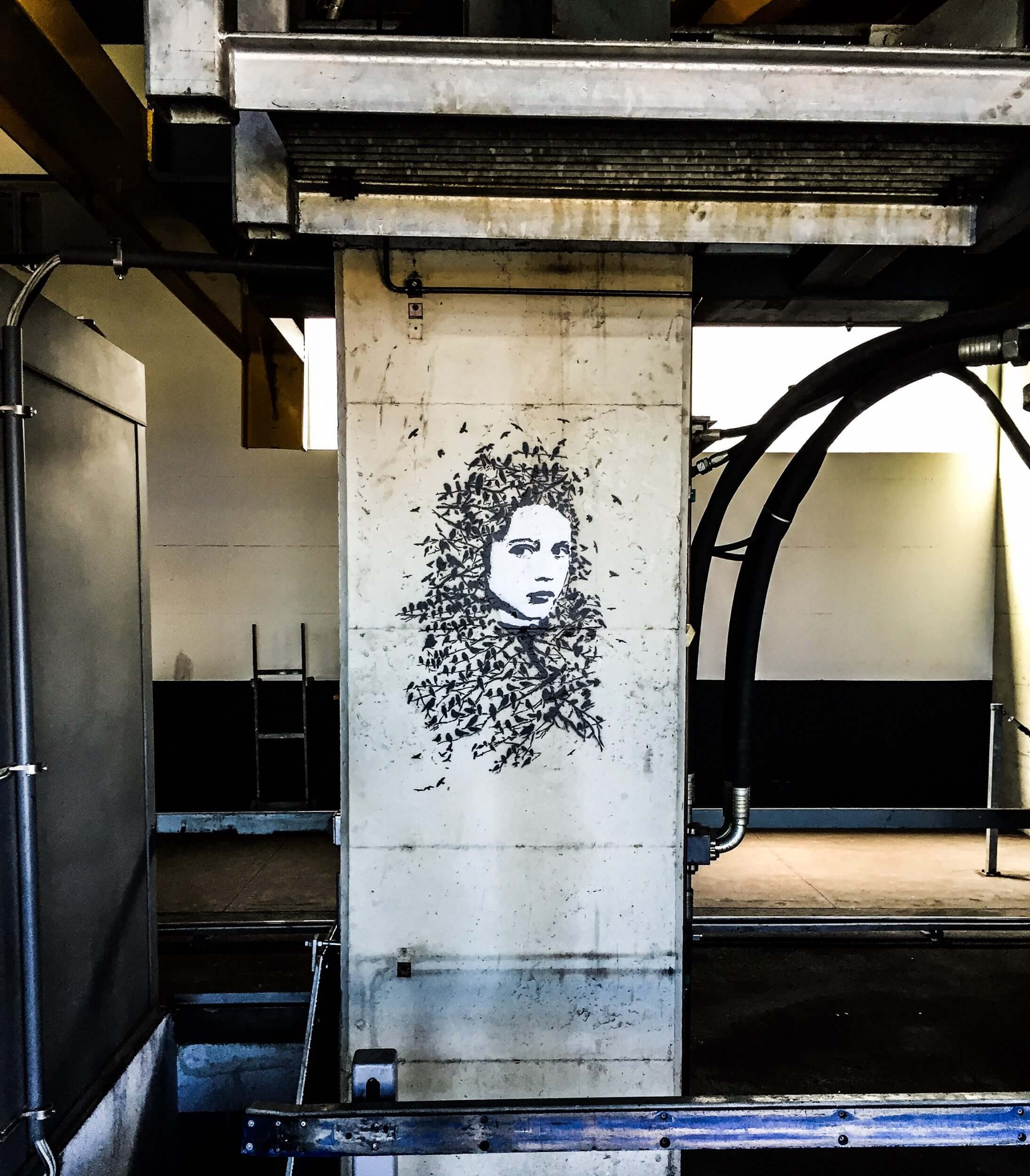 Jasm1 (Issam Rezgui) bases his murals by inspiration of the areas origins taking advantage of minimalism to recreate the human and emotional complexity.