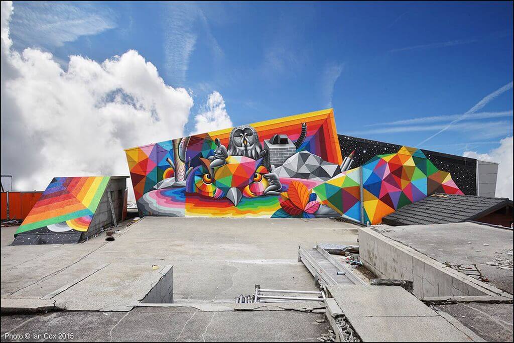 Okuda San Miguel of Santander, is known for his distinct style, geometric prints and multicoloured buildings. The mastery of Okuda, transforming its walls into a fantastic world full of surreal figures drops the jaw of any viewer. Here we see an owl meaning wisdom standing out through the grey concrete.