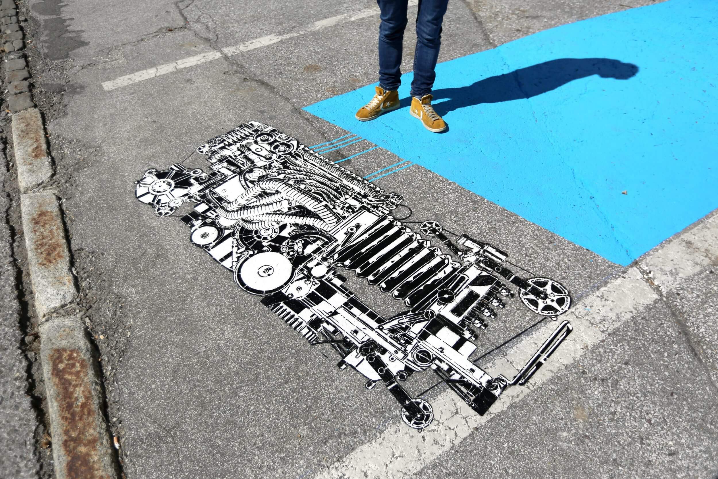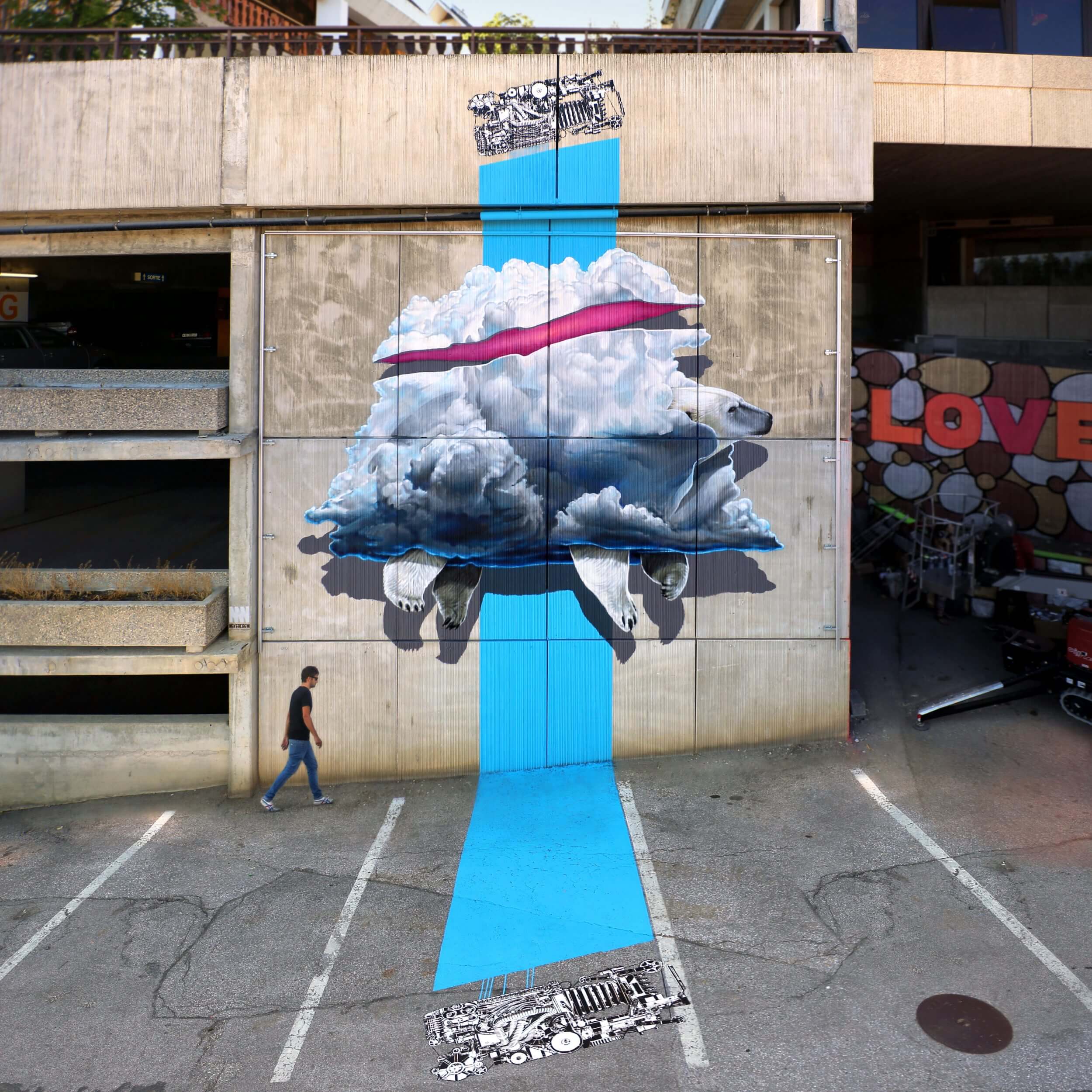 Felipe Pantone works ranges from graffiti to kinetic art. They are marked by strong contrasts, bright colours and the use of mixed techniques, blended perfectly together. Pantone adapts his work to the environment that surrounds giving the impression that everything is in harmony. Here he has included the grids of the carpark into his work.