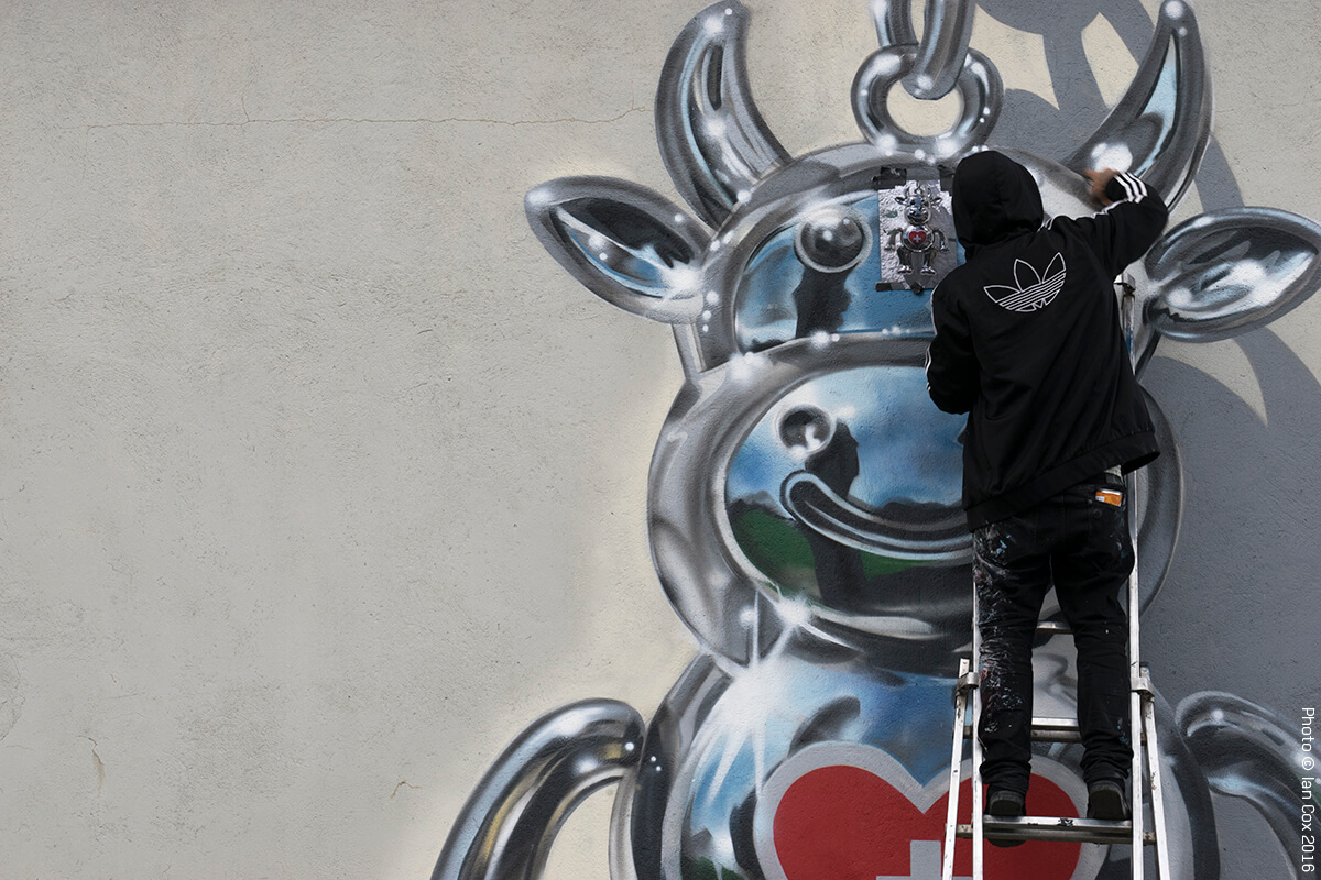 Fanakapan pushes back street art’s limits by creating a 3D illusion. Since 2010 he creates murals representing helium balloons. For this wall Fanakapan wandered through the local Friday market looking for something typical swiss and picked out a shiny chrome key chain representing a cow. The 3D painting is absolutely amazing picturing also the shadows of the environment, the sky and the reflection of the sun.