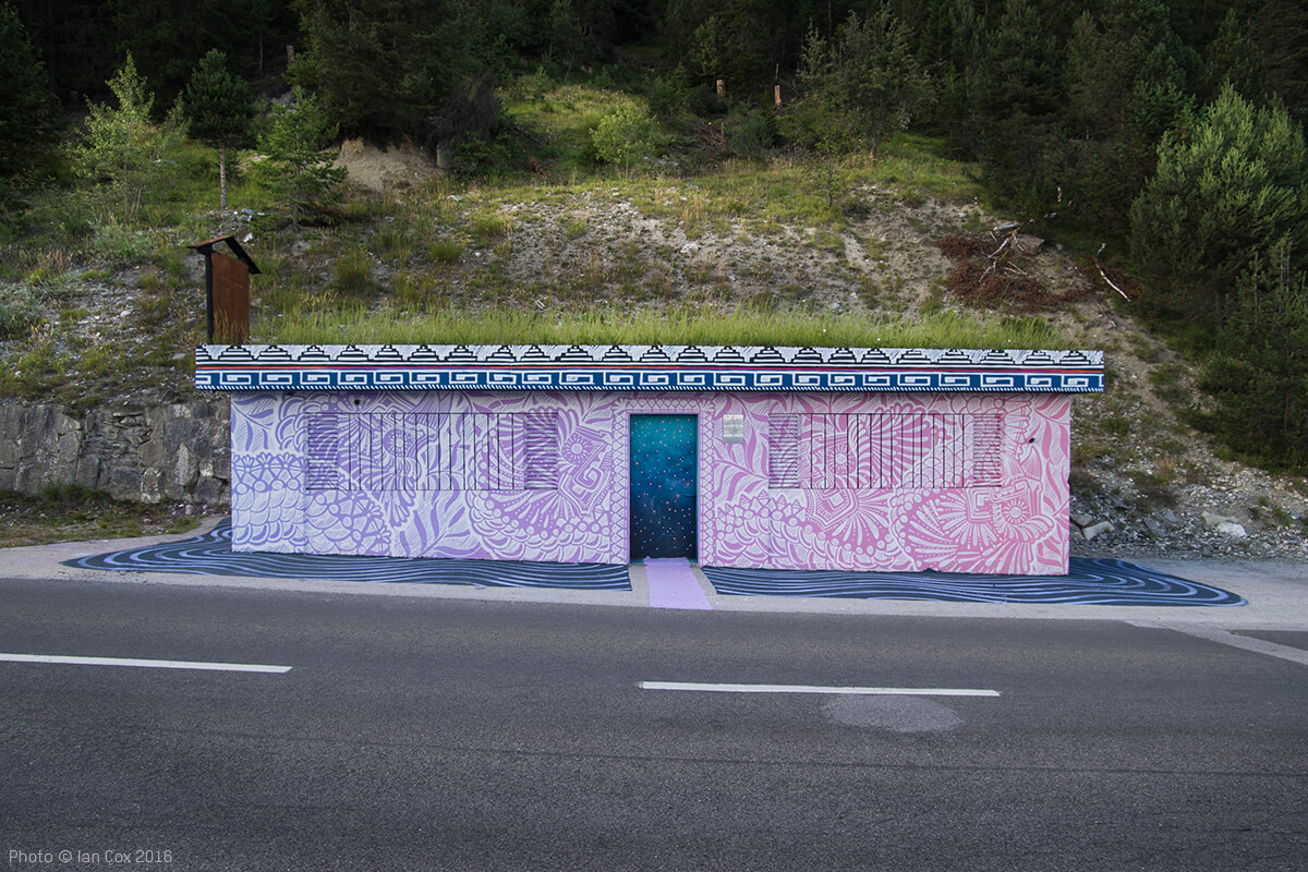 The two Spanish artists, Okuda and Felipe Pantone, who were part of the first edition have returned to Crans-Montana this spring to paint together a big mural on the parking lot of the cable car Les Violettes during the well-known electro music festival Caprices and huge panels in the smoking parlor of the festival’s tent. It was the first time that they shared a space and the results are amazing…