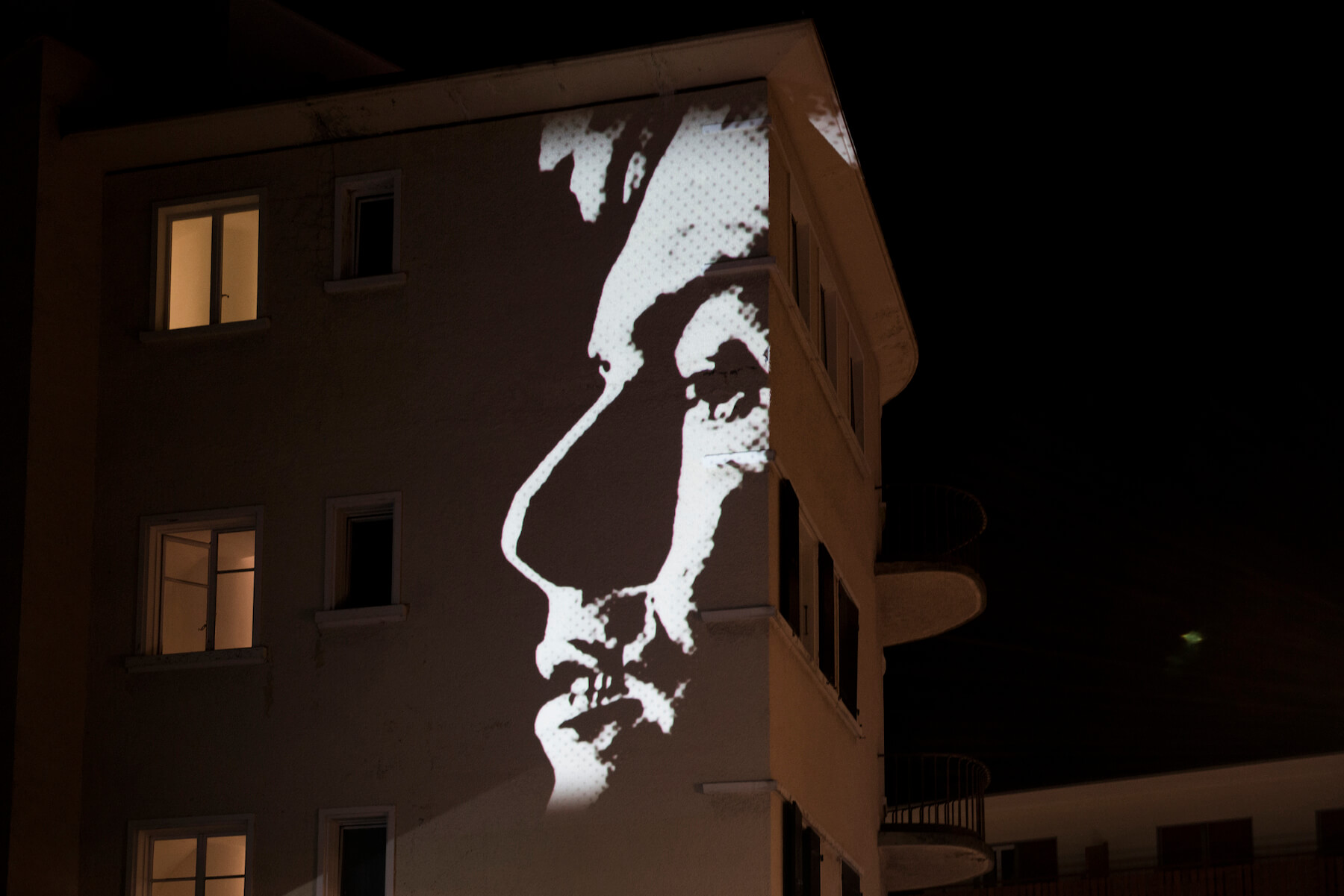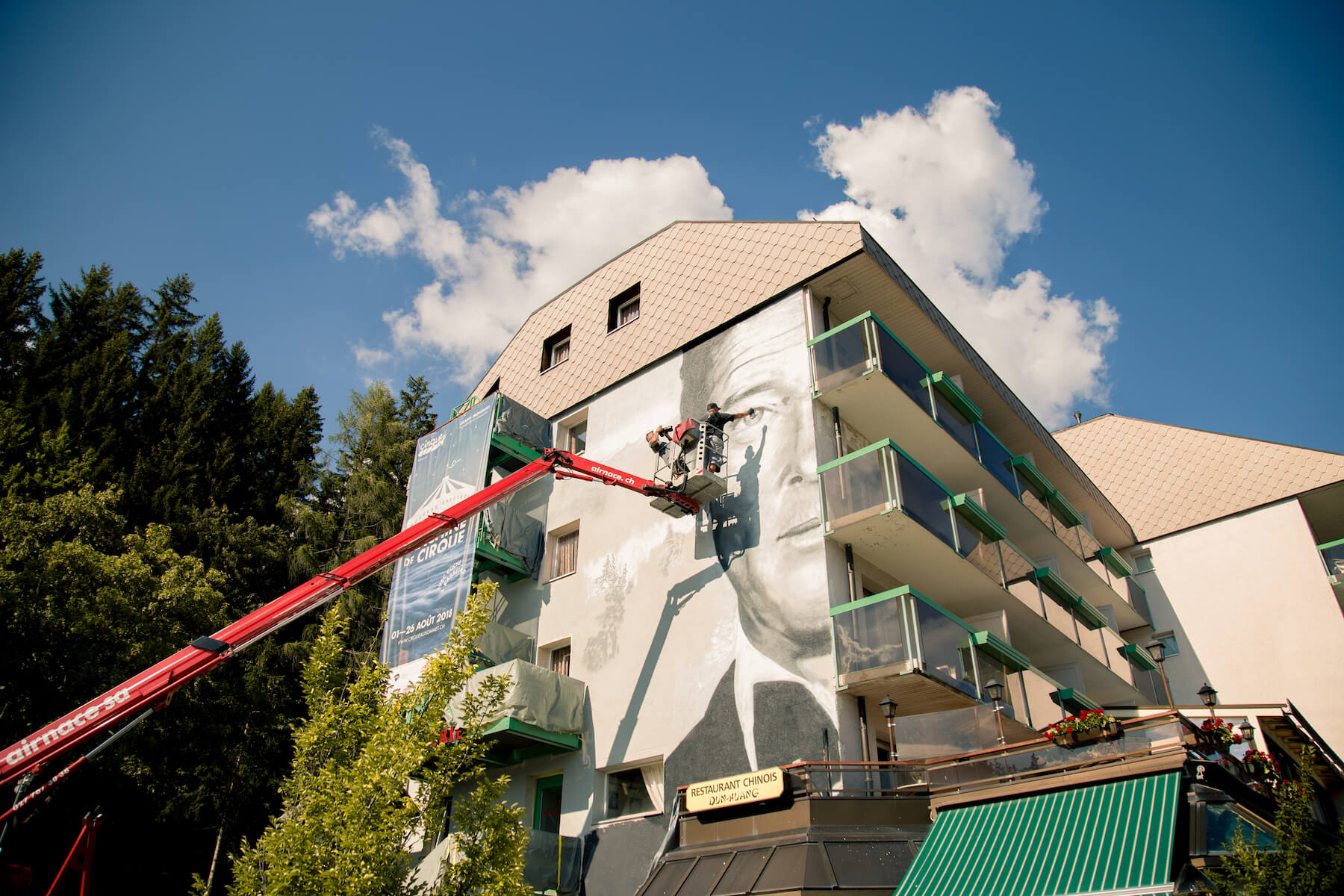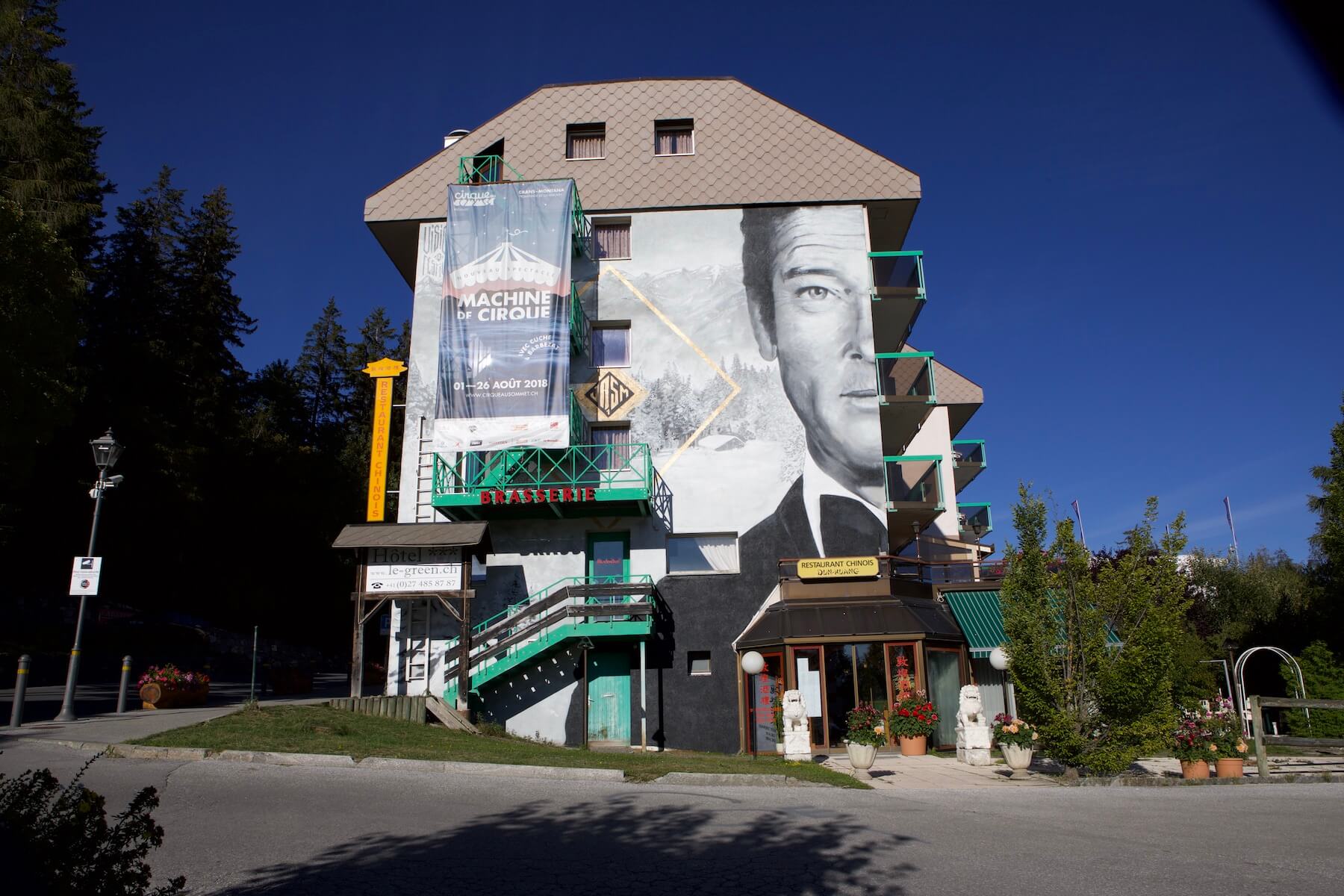 JASM ONE painted an amazing portrait on the hotel Le Green! entitled “Shaken, Not Stirred” and is a tribute to prominent resident of Crans Montana, 007 Roger Moore, where he lived his 30 last years.