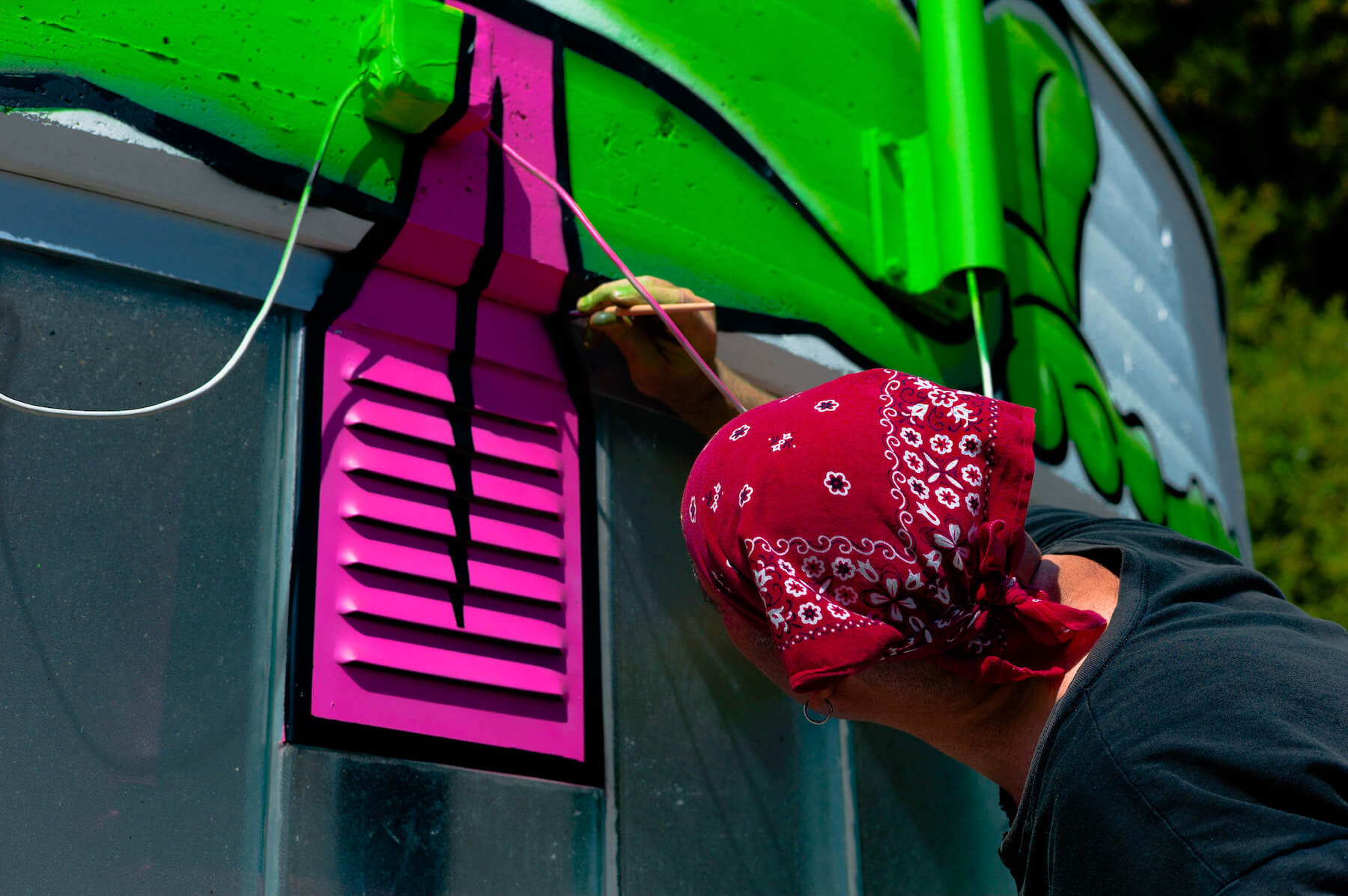 Obed Osorio paints his mural under the ski lift …