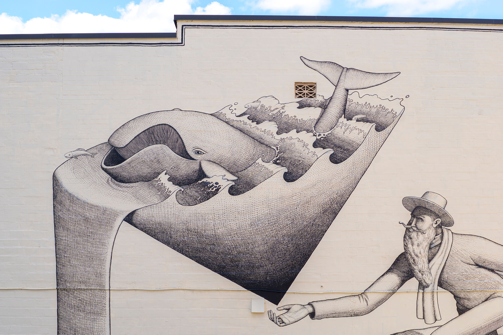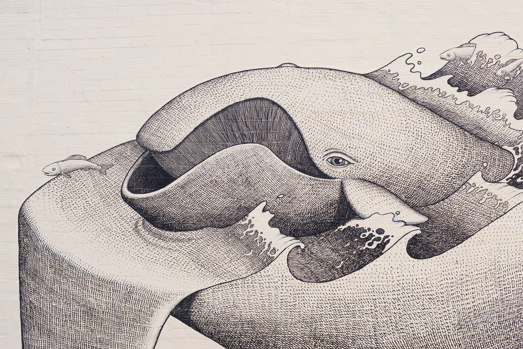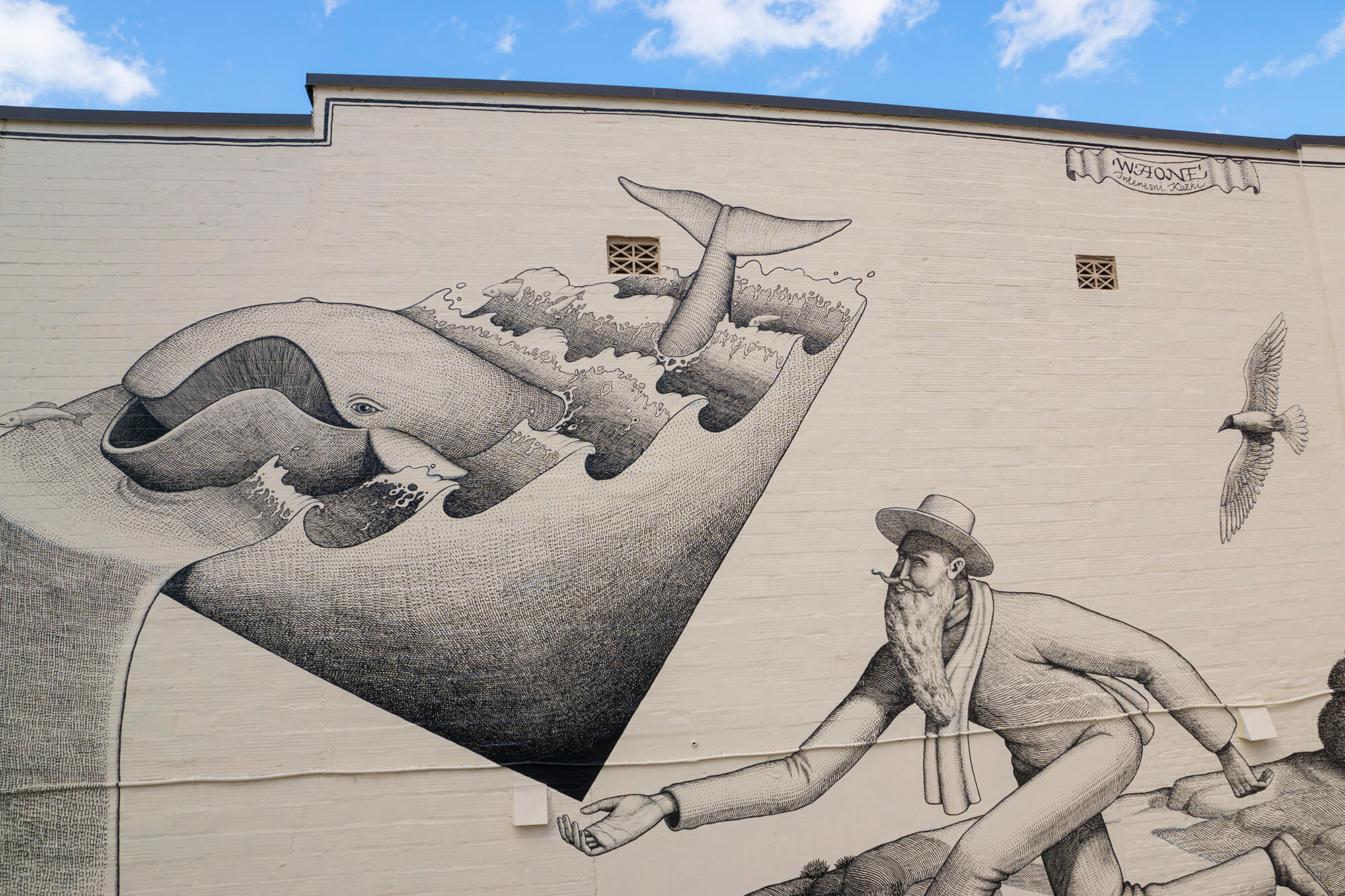 Waone’s mural aims to raise awareness to the dwindling population of North Atlantic right whales and reminds the viewer that failure to act now increases the whales vulnerability to extinction.