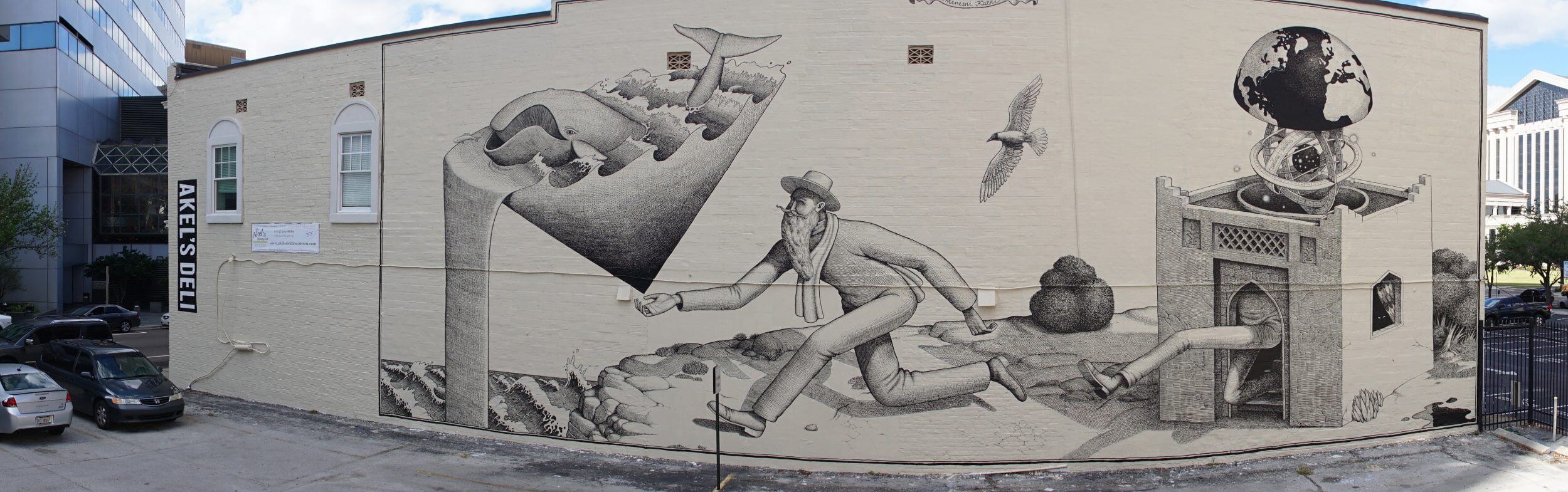 “The mural is dedicated to raise awareness about the North Atlantic whales, which are one of the most endangered of all large whales, with a long story of human exploitation and no signs of recovery despite protection since the 1930s. They reside around Cape Cod and the Bay of Fundy during the summer, but females migrate to North Florida and Georgia during winter time to give birth in the coastal waters of Jacksonville…where this mural is located.” Waone